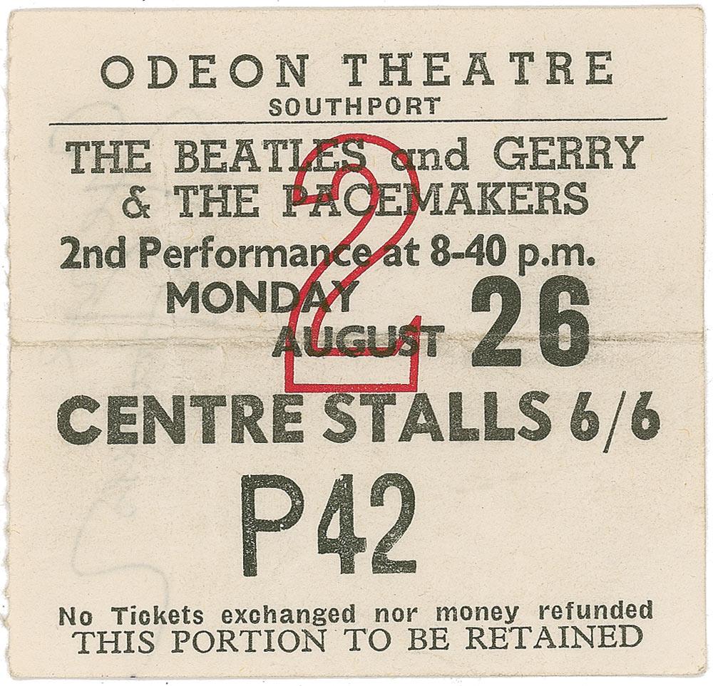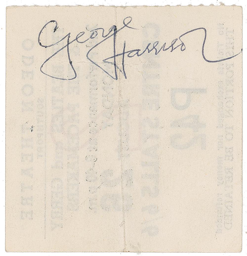 Original ticket stub, 2.5 x 2.5, from the Beatles August 26, [1963] 8:40 pm performance at the Odeon Theatre in Southport, signed on the reverse in ballpoint, “George Harrison.” A central vertical fold, one through a single letter of first and last name of signature, and expected light wrinkling and creasing, otherwise fine condition. This was the first night of a five-night run at the Odeon, near the end of their 1963 summer tour. Any concert-related signed item is highly prized by Beatles collectors.