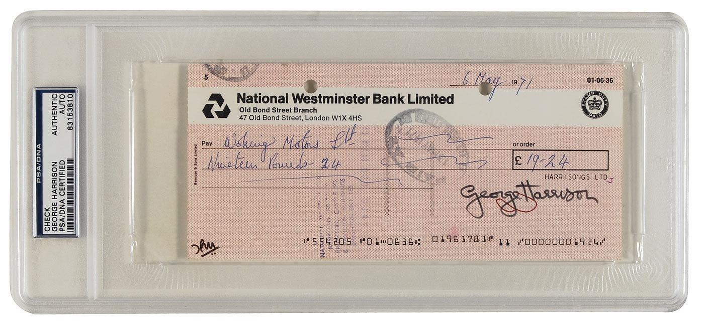Harrisongs Ltd. check, 7.75 x 3.5, filled out in another hand and signed by Harrison, payable to Wokling Motors Ltd. for £19.24, May 6, 1971. Encapsulated in a plastic PSA/DNA authentication holder. In fine condition, with punch holes to top, cancellation stamps to body, and a red ink cancellation over small portion of signature.