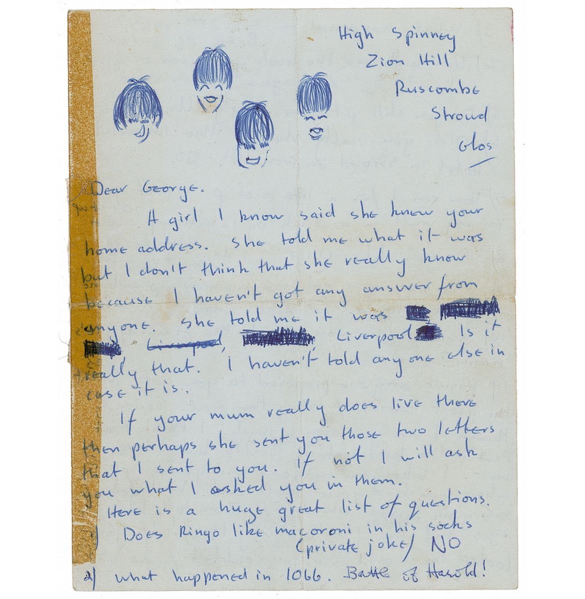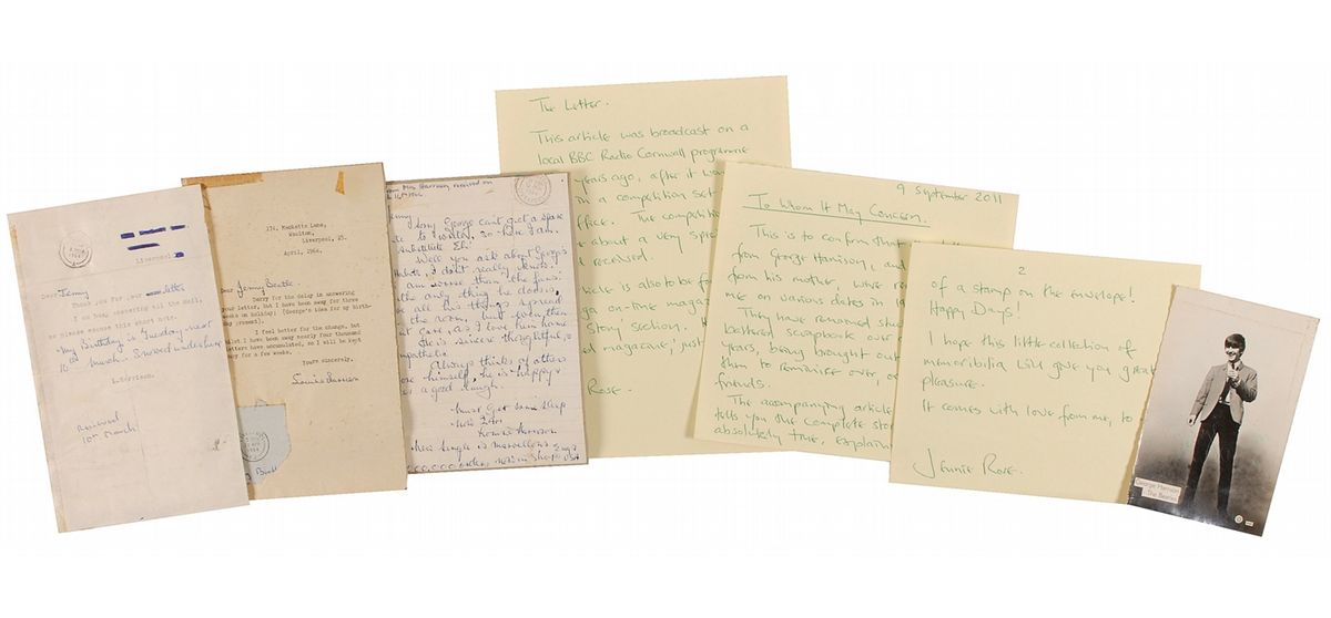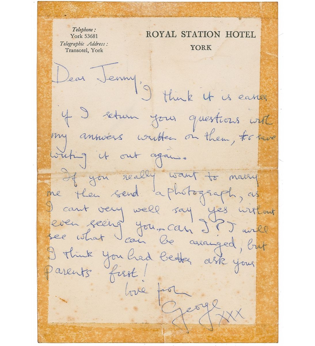 Humorous and insightful collection of six George Harrison-related items: ALS signed, “Love from, George XXX,” one page, 5 x 7, Royal Station Hotel, York letterhead, no date. Harrison responds to a particularly adorable letter from a fan, Jenny Rose, in full: “I think it easier if I return your questions with my answers written on them, to save writing it out again. If you really want to marry me then send a photograph, as I can’t very well say yes without ever seeing you…can I? I will see what can be arranged, but I think you had better ask your parents first!”; the letter to which Harrison was responding, two pages, complete with his responses to a long list of fan questions, including, “Does Ringo like macoroni [sic] in his socks,” “How high are the heels you wear on your shoes,” and “How can I fit a life size picture of you on my wall in a 5 inch by 12 inch gap?”; three ALSs from Harrison’s mother, Louise Harrison, to the same fan, dated between March and April of 1964; and a glossy 3.5 x 5.5 publicity photo of Harrison, signed on his behalf in green ballpoint by his mother, “George Harrison, XXX.” In very good condition, with a central horizontal and vertical fold, heavy border of mounting remnants, mildly affecting the signature, and scattered light spotting to George’s letter, and similar attributes to the remaining items. Accompanied by the original mailing envelope to the fan letter, and a letter of provenance from Rose. Harrison’s response to Jenny Rose dates to November 27, 1963, the day the Beatles played a concert at the Rialto Theatre in York.
