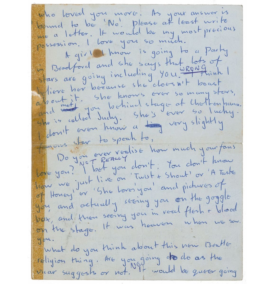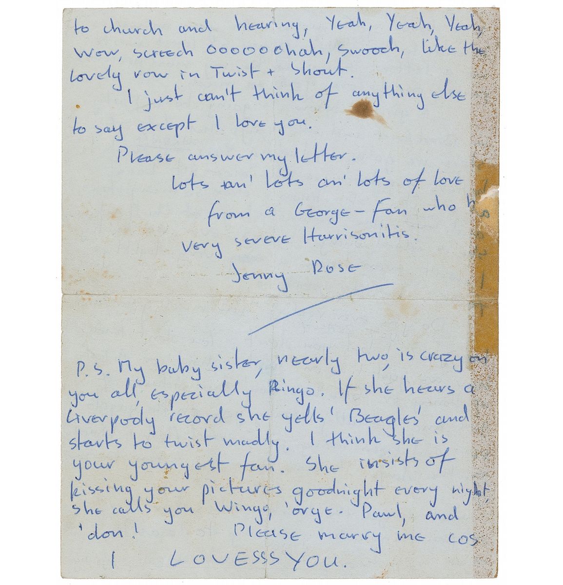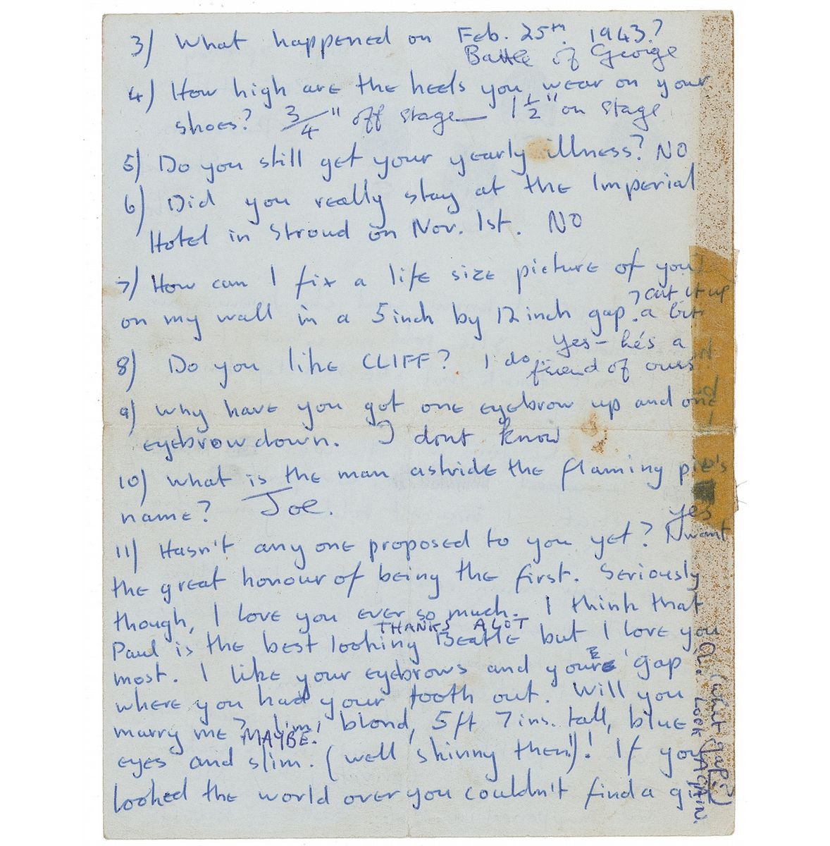 Humorous and insightful collection of six George Harrison-related items: ALS signed, “Love from, George XXX,” one page, 5 x 7, Royal Station Hotel, York letterhead, no date. Harrison responds to a particularly adorable letter from a fan, Jenny Rose, in full: “I think it easier if I return your questions with my answers written on them, to save writing it out again. If you really want to marry me then send a photograph, as I can’t very well say yes without ever seeing you…can I? I will see what can be arranged, but I think you had better ask your parents first!”; the letter to which Harrison was responding, two pages, complete with his responses to a long list of fan questions, including, “Does Ringo like macoroni [sic] in his socks,” “How high are the heels you wear on your shoes,” and “How can I fit a life size picture of you on my wall in a 5 inch by 12 inch gap?”; three ALSs from Harrison’s mother, Louise Harrison, to the same fan, dated between March and April of 1964; and a glossy 3.5 x 5.5 publicity photo of Harrison, signed on his behalf in green ballpoint by his mother, “George Harrison, XXX.” In very good condition, with a central horizontal and vertical fold, heavy border of mounting remnants, mildly affecting the signature, and scattered light spotting to George’s letter, and similar attributes to the remaining items. Accompanied by the original mailing envelope to the fan letter, and a letter of provenance from Rose. Harrison’s response to Jenny Rose dates to November 27, 1963, the day the Beatles played a concert at the Rialto Theatre in York.