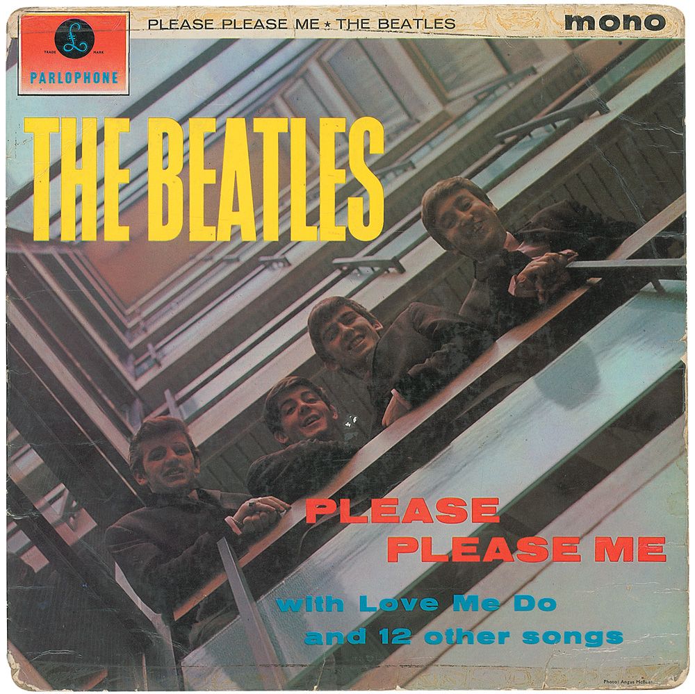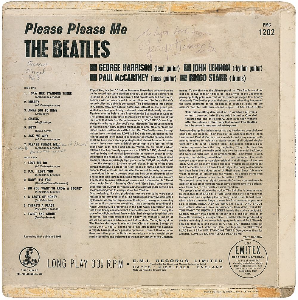 Please Please Me album (original Parlophone first UK Beatles release) signed and inscribed on the back cover in ballpoint, “To Lynn, Love from George Harrison xxxx.” In good to very good condition, with tape repairs and reinforcement to edge separations, scattered moderate creasing, some mild soiling and toning, including some over signature, and a few other notations on back cover. The record is included. Consignor notes that the album was signed circa 1963.
