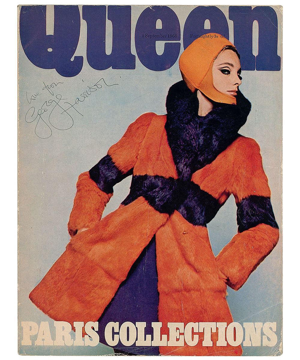 Queen magazine featuring the Paris fashion collection, dated September 1, 1966, 9.5 x 12.5, 92 pages, signed on the front cover in black ink, “Love from George Harrison.” Scattered bends and creases to the cover (none affecting the signature), otherwise fine condition.