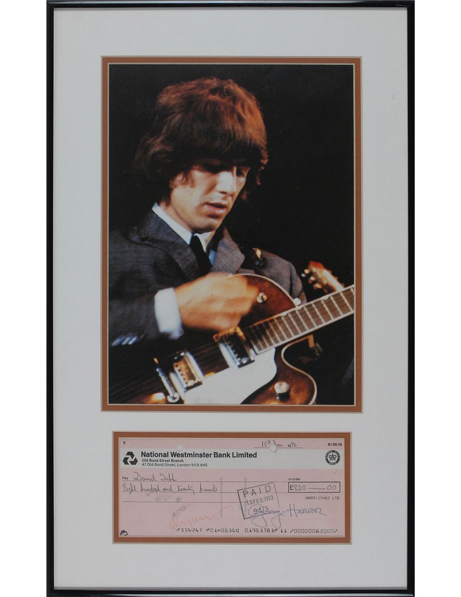 Harrisongs Ltd. business check, 7.5 x 3.5, filled out in another hand and signed by Harrison, payable to David Tabb for £820.0.0, January 10, 1972. Double-matted and framed with a large color portrait of Harrison on stage as a member of the Beatles to an overall size of 12.5 x 20.5. In fine condition, with a bank stamp over first name of signature, a couple other stamps and notations, and two punch holes to top edge.