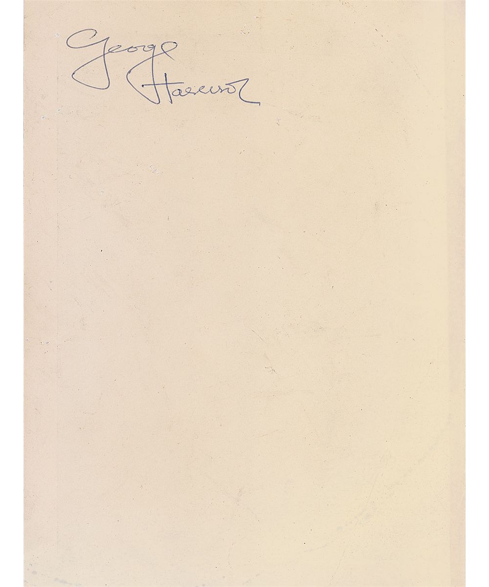 Vintage semi-glossy 6 x 8 cardstock publicity photo of the Beatles, signed on the reverse in blue ballpoint, “George Harrison.” Scattered creases and a professionally removed tape stain to reverse, otherwise fine condition. Accompanied by a certificate of authenticity from Tracks, stating that the signature dates to late 1963. The photo was originally included as an insert in the autumn 1963 Beatles UK tour program.