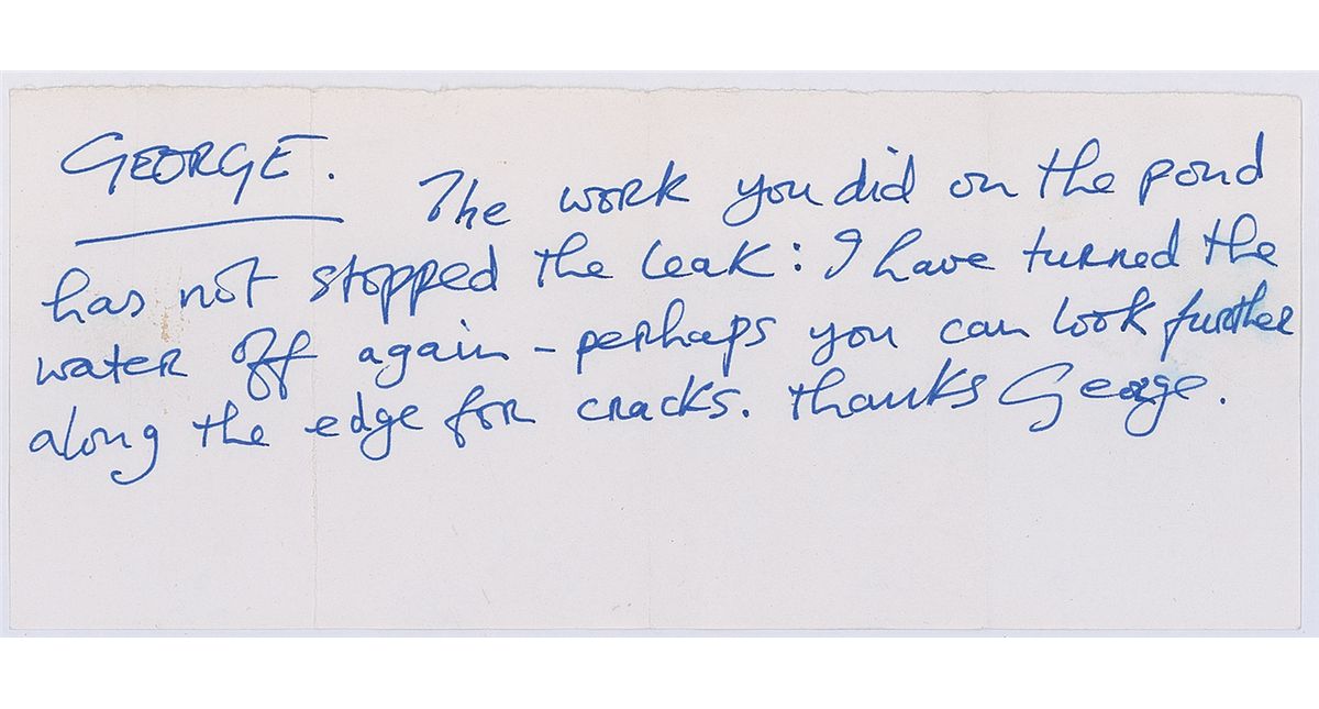ANS signed “George,” one page, 8.25 x 3.5, circa 1980s. Note for one of his gardeners at Friar Park, George Robb. In full: “GEORGE. The work you did on the pond has not stopped the leak: I have turned the water off again—perhaps you can look further along the edge for cracks. Thanks, George.” Three vertical folds and light scattered creases, otherwise fine condition. Accompanied by a certificate of authenticity from Tracks.