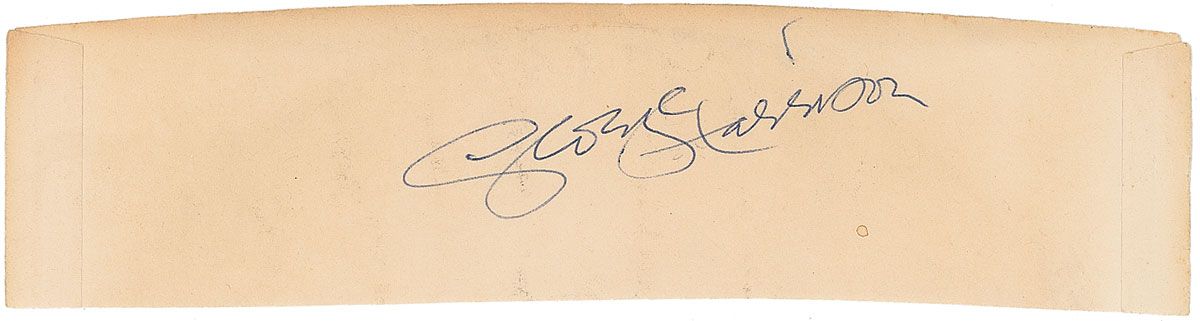 Ballpoint signature, “George Harrison,” on an off-white 7.25 x 1.75 slip. Light creases and toning, otherwise fine condition.