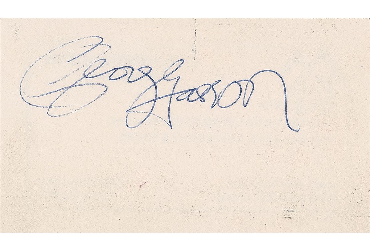 Ballpoint signature, “George Harrison,” on the reverse of an off-white 3.5 x 2 business card. In fine condition, with trivial soiling and some skipping to the first letter of the signature. Consignor notes that the signature was obtained in person at a supermarket in Tahoe City.