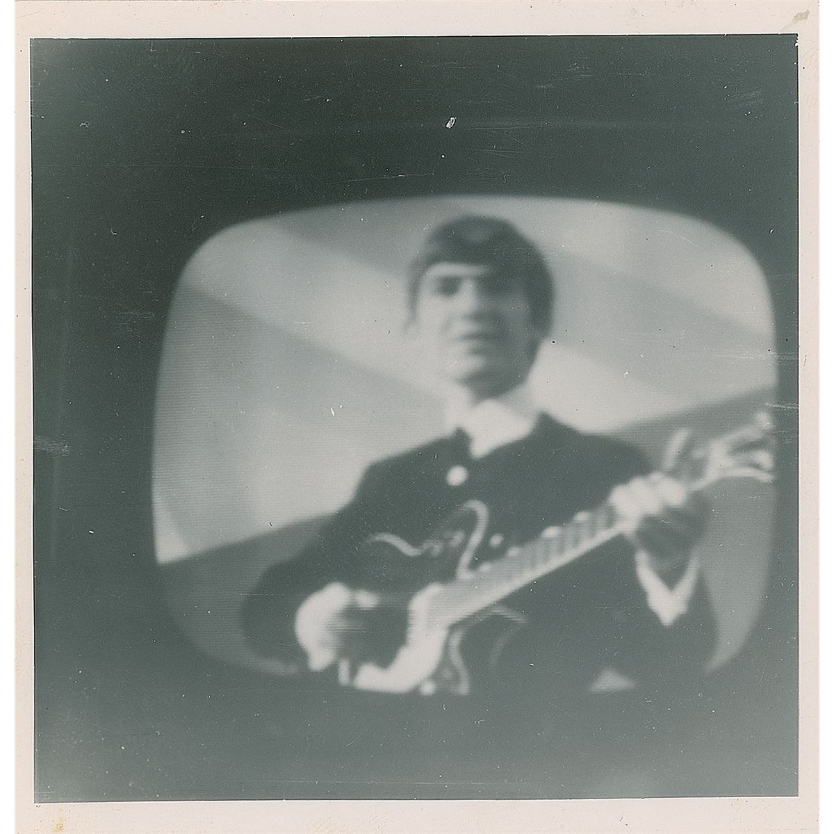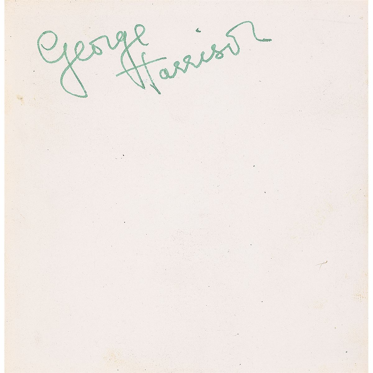 Unusual vintage circa 1963–1964 glossy 3.25 x 3.5 snapshot photo of a television showing Harrison during a performance, neatly signed on the reverse in fountain pen, “George Harrison.” In fine condition. Accompanied by a certificate of authenticity from Tracks.