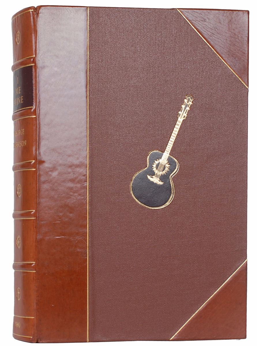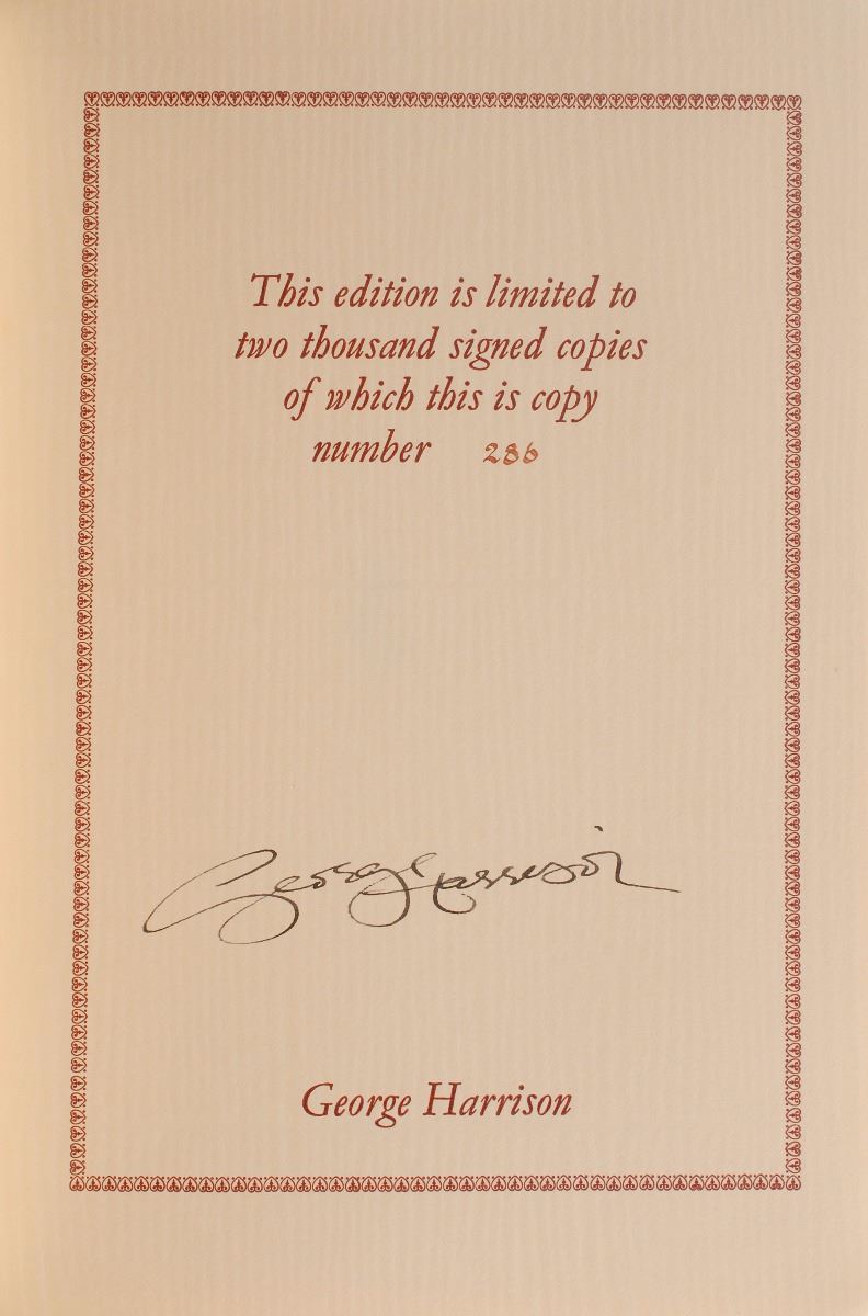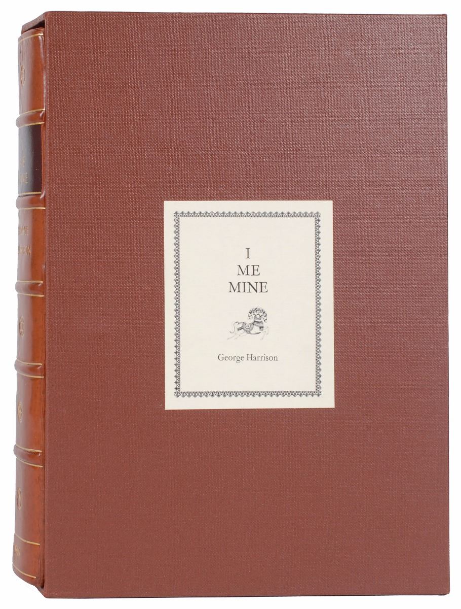 Signed book: I, Me, Mine. Limited edition, numbered 286/2000. Surrey, England: Genesis Publications, 1980. Hardcover with slipcase, 7.25 x 10.25, 398 pages. Signed on the colophon in fountain pen by Harrison. Autographic condition: very fine. Book condition: VG+/None in a NF slipcase.