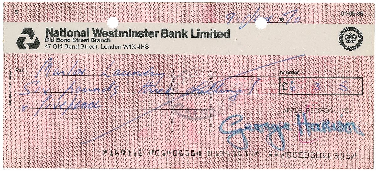 Apple Records business check, 7.75 x 3.5, filled out in another hand and signed by Harrison, payable to Marlow Laundry for £6.3.5, June 9, 1970. In fine condition, with Harrison retracing a weak felt tip signature with bold blue ballpoint. This check dates to just two months after the announcement of the Beatles breakup; Harrison was then working on his first solo album, All Things Must Pass, which was released by Apple Records later in 1970.