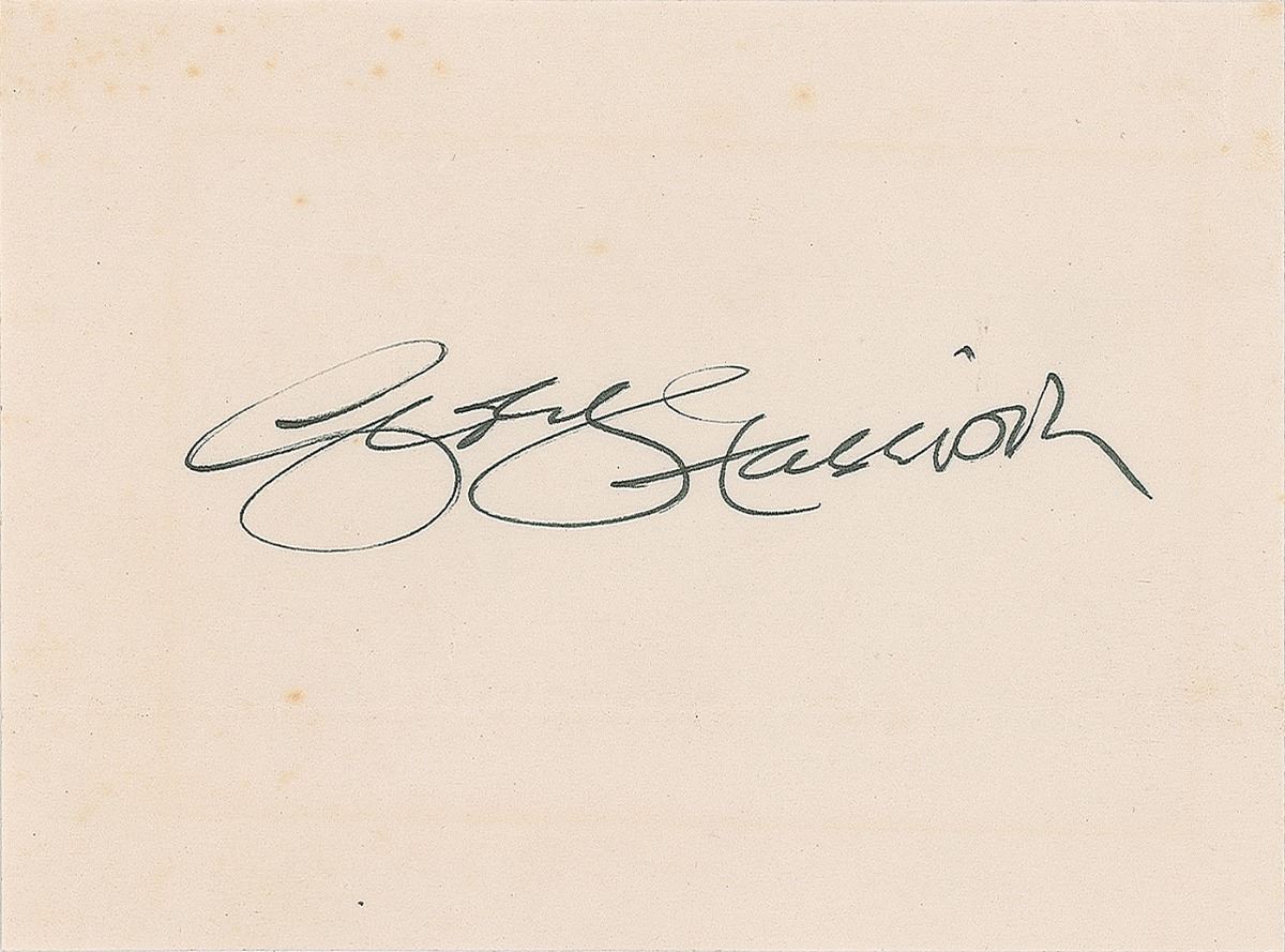 Crisp ink signature, “George Harrison,” on an off-white 4.25 x 3 slip. In fine condition, with fold at the bottom, easily matted out. An ideal Harrison signature with excellent display potential.