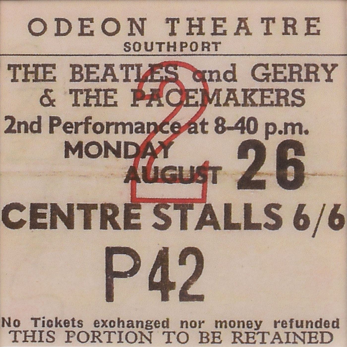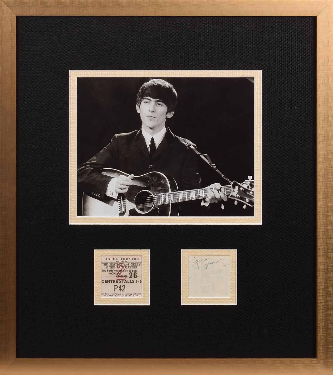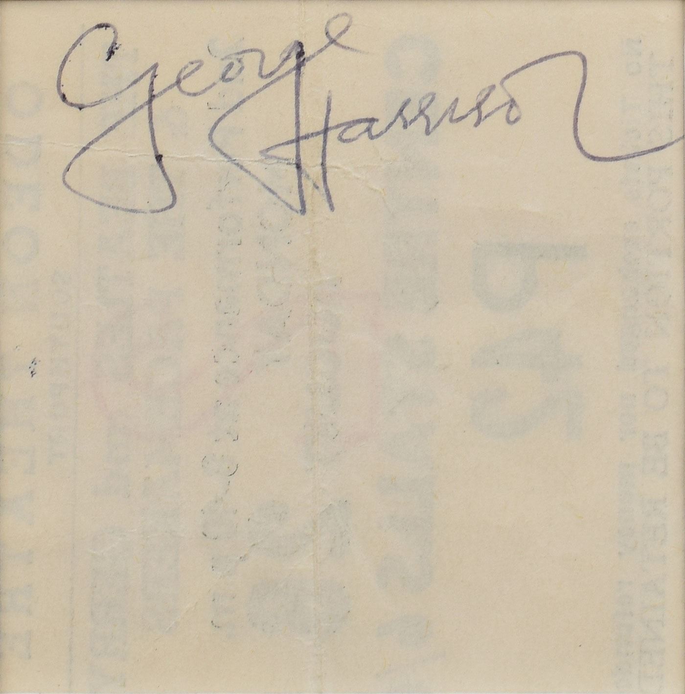 Original ticket stub from the Beatles' 8:40 PM show at the Odeon Theatre in Southport on August 26, 1963, 2.25 x 2.25, signed on the reverse in ballpoint, "George Harrison." Impressively double-matted and framed with a photographic reproduction of the front of the ticket and an image of Harrison to an overall size of 18.5 x 21. In fine condition, with a central vertical fold and light wrinkling. This was the first night of a five-night run at the Odeon, near the end of their 1963 summer tour. Any concert-related signed item is highly prized by Beatles collectors.