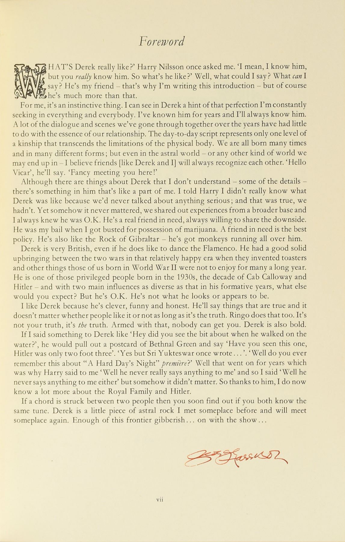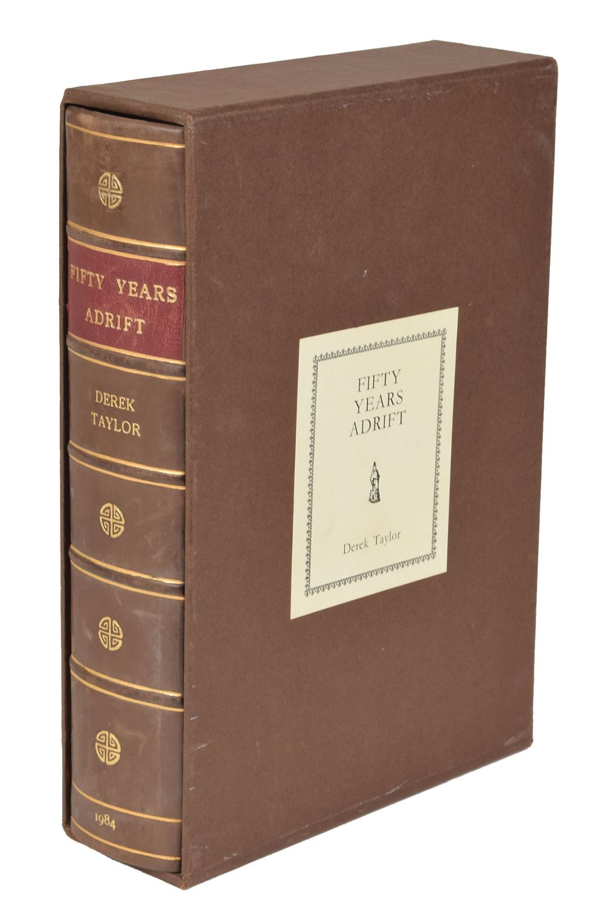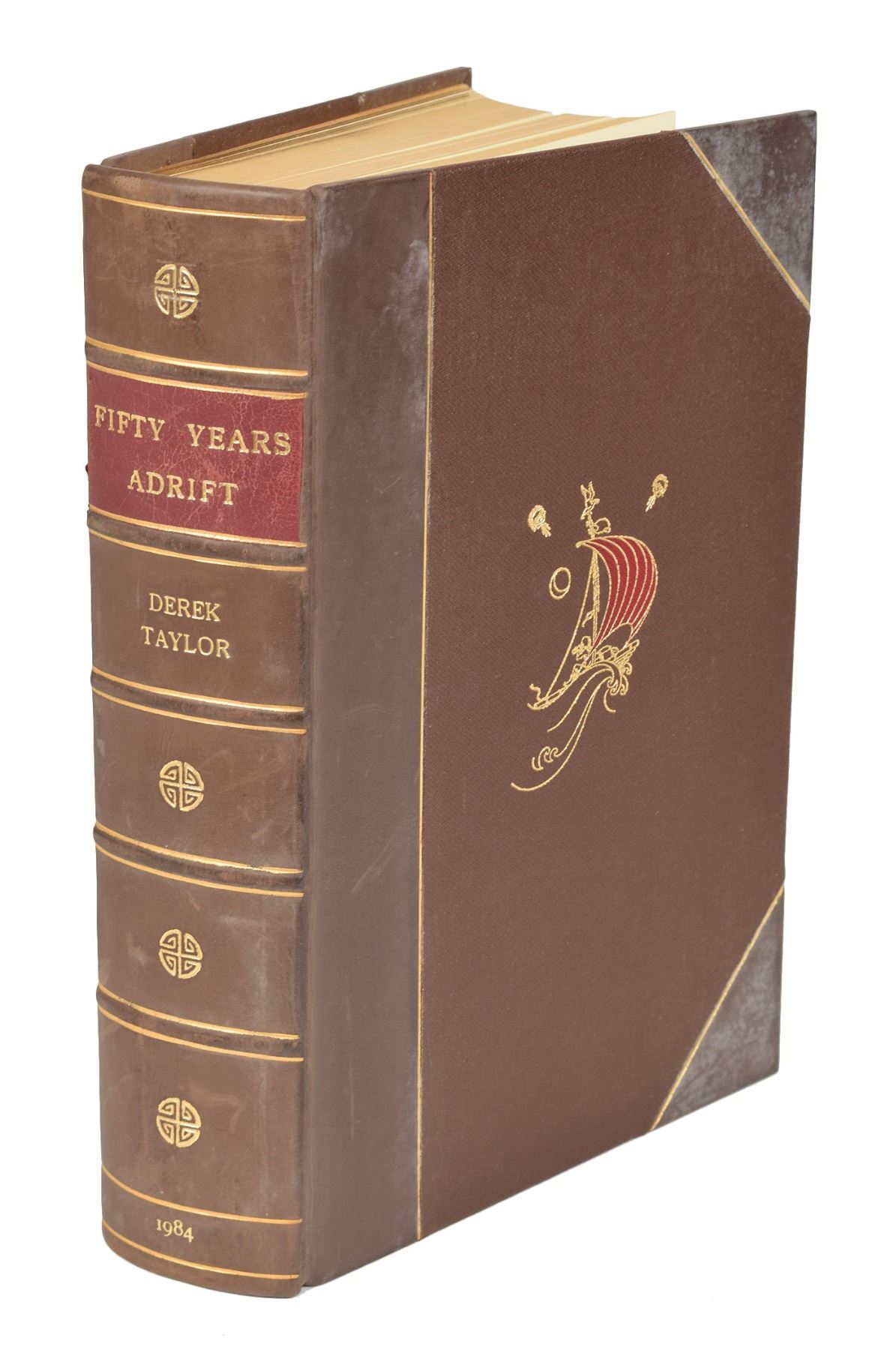 Signed book: Fifty Years Adrift. Limited first edition, numbered 206/2000. England: Genesis Publications, 1984. Hardcover with slipcase, 7 x 9.75, 541 pages. Signed at the bottom of the foreword page in brown ink, "George Harrison." Also signed by the author on the colophon in blue ballpoint, "Derek Taylor." Autographic condition: fine. Book condition: