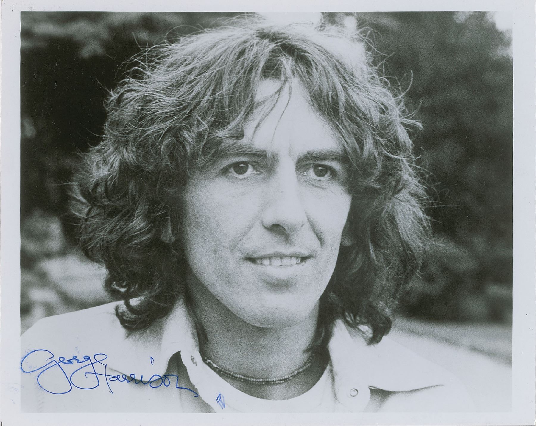 Wonderful glossy 10 x 8 photo of George Harrison in a peaceful close-up pose from circa 1976, signed in blue ink. In very good to fine condition, with scattered light creasing.