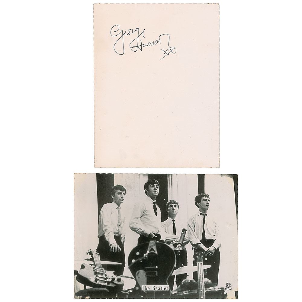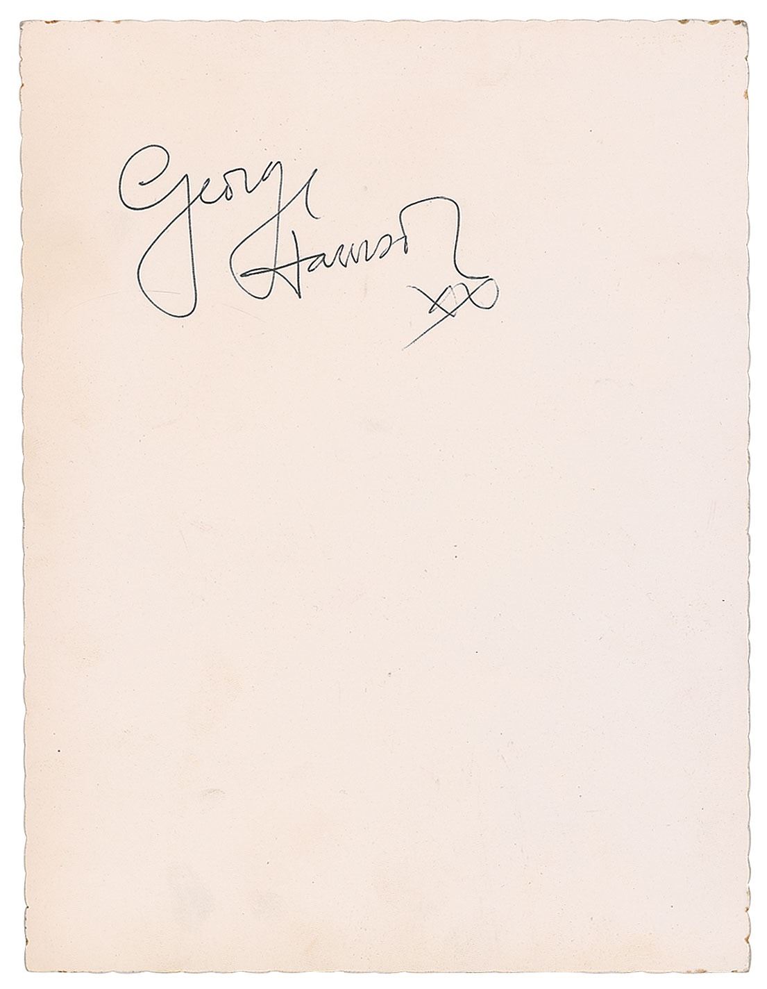 Vintage glossy 6 x 7.75 Top Star promotional photo of the Beatles posing in the studio with their instruments, signed on the reverse in black ballpoint, "George Harrison, xx." The original photo was taken by Dezo Hoffman at Abbey Road Studios on September 4, 1962, when the Beatles were recording their first single, 'Love Me Do.' In fine condition. Consignor notes that the signature dates to mid-1963. Accompanied by a certificate of authenticity from Tracks.