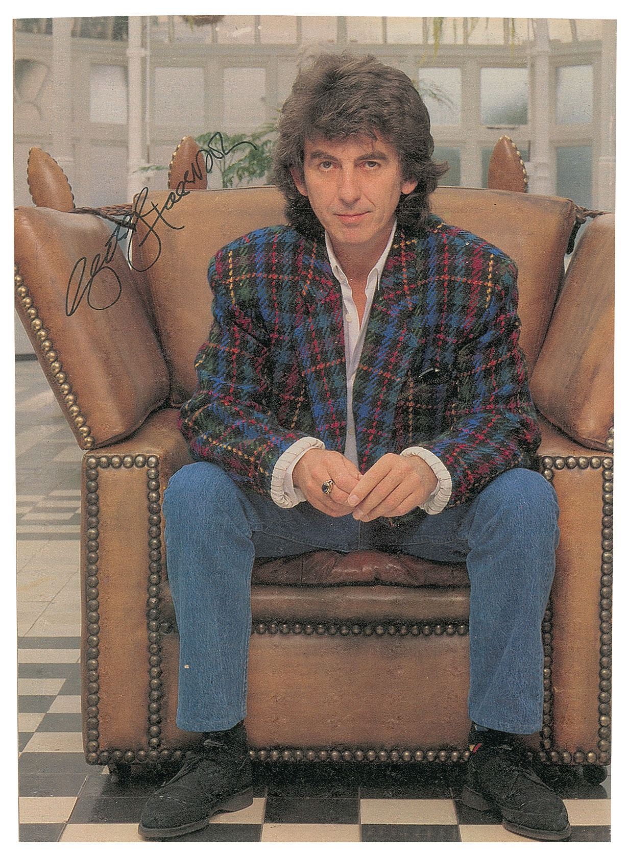 Fantastic color 7.5 x 10.5 magazine photo of George Harrison in a full-length seated pose, signed in black ink. The photo is affixed to a same-size sheet. In fine condition. Accompanied by a letter of provenance from the prior owner, in part: “The George Harrison signed image…was in a lot I bought at auction recently. There were other lots from the same source which I did not win. The autographs were collected by a person who worked for Dudley & District Hospital Broadcasting Radio.” Consignor notes that the autograph dates to the late 1980s. Accompanied by a certificate of authenticity from Tracks.