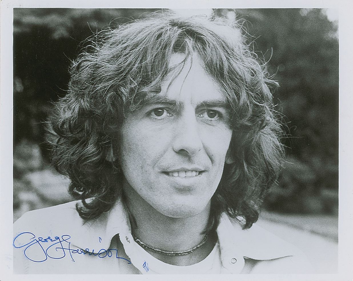 Wonderful glossy 10 x 8 photo of George Harrison in a peaceful close-up pose from circa 1976, signed in blue ink. In very good to fine condition, with scattered light creasing, and a faint paperclip impression to the top edge. Accompanied by a certificate of authenticity from Tracks.