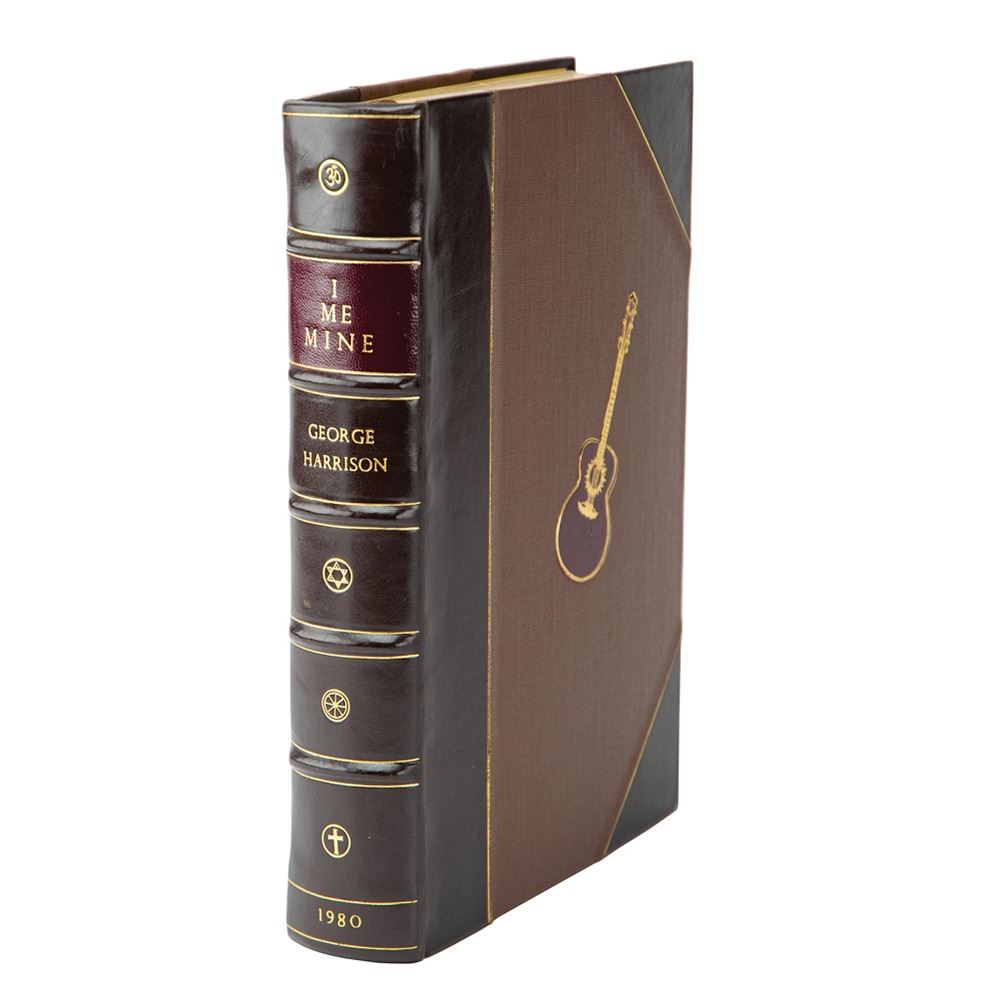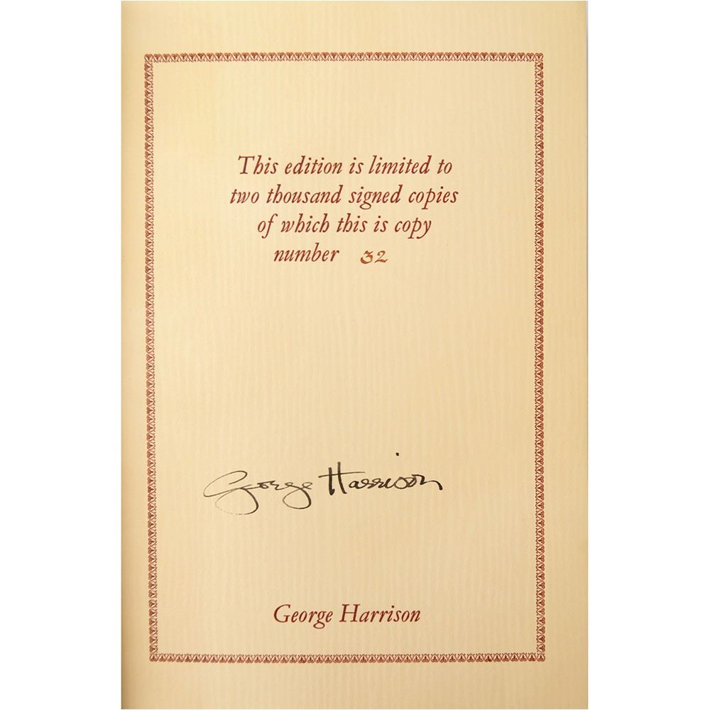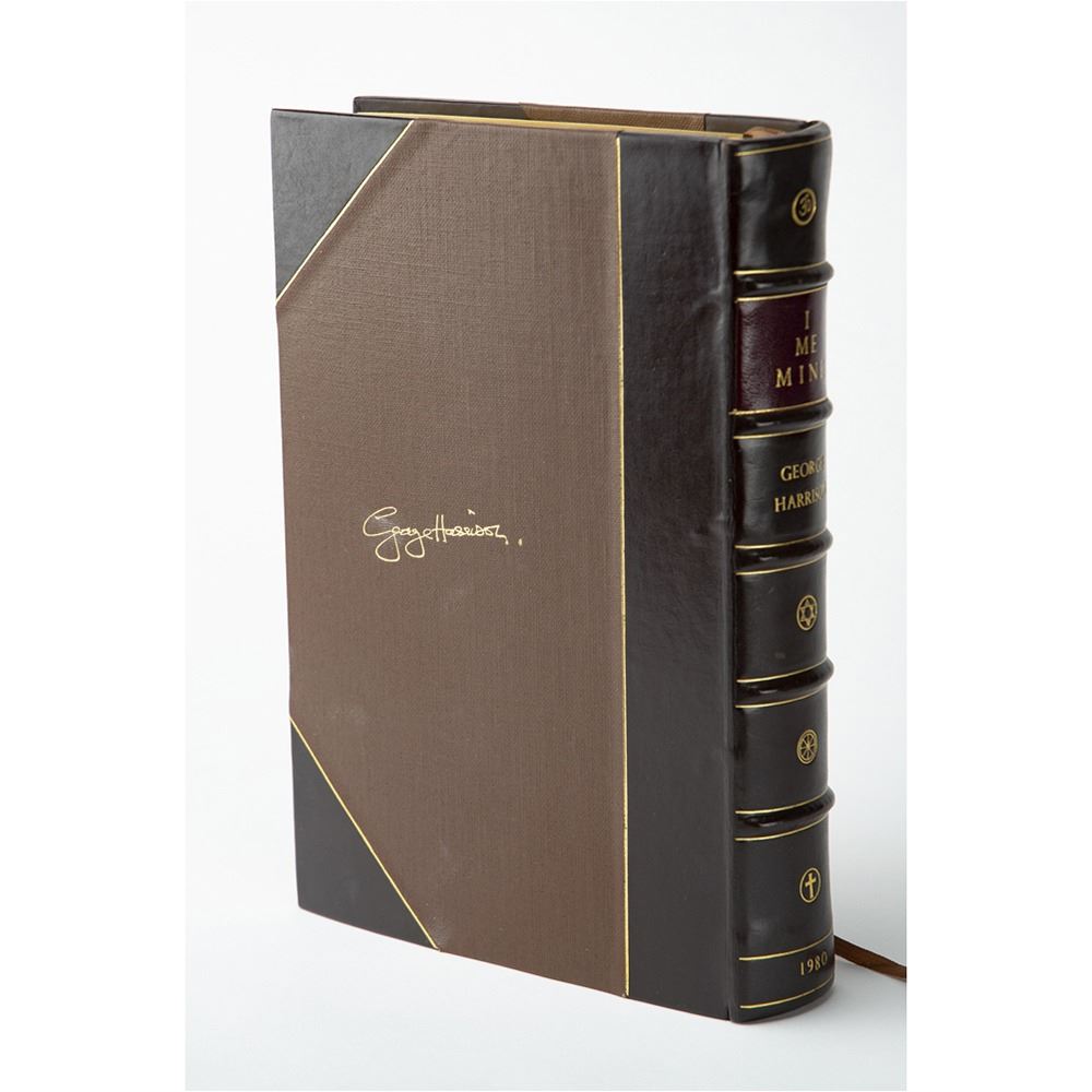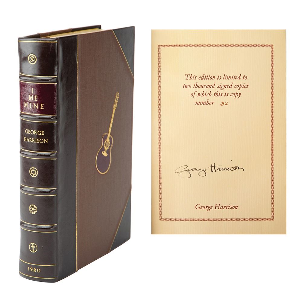 Signed book: I, Me, Mine. Limited edition, numbered 32/2000. Surrey, England: Genesis Publications, 1980. Hardcover with slipcase, 7.25 x 10.25, 398 pages. Signed on the colophon in fountain pen by George Harrison. In very fine condition. A superlative and low-number example of this lavish leatherbound volume.