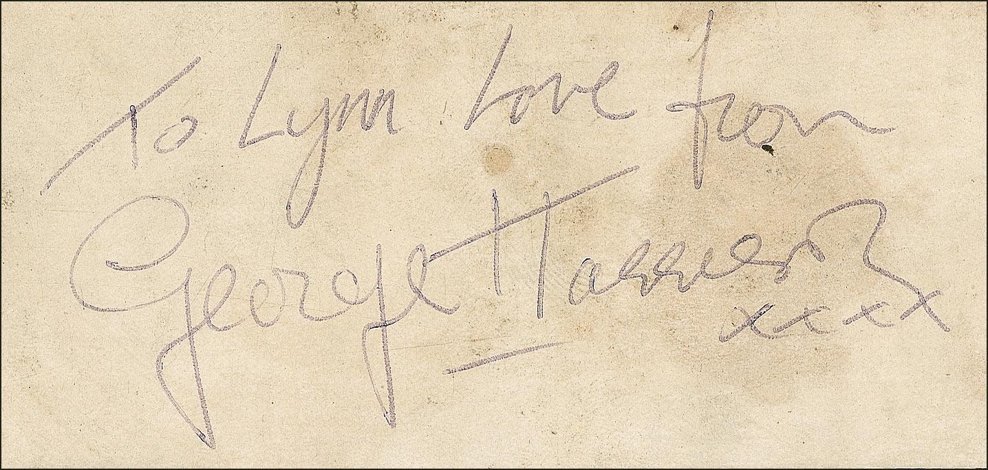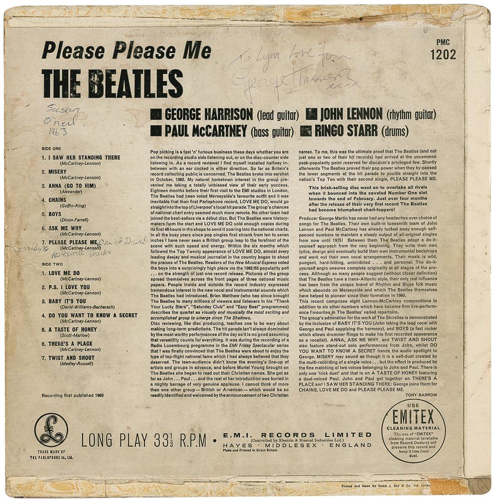 Please Please Me album signed and inscribed on the back cover in ballpoint, “To Lynn, Love from George Harrison xxxx.” In very good condition, with tape repairs and reinforcement to edge separations, scattered creasing soiling, and toning, and a few other notations on back cover. The record is included.