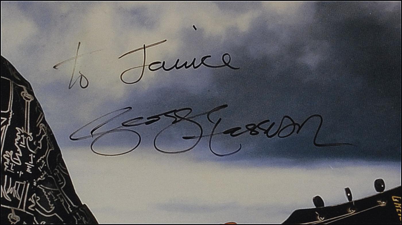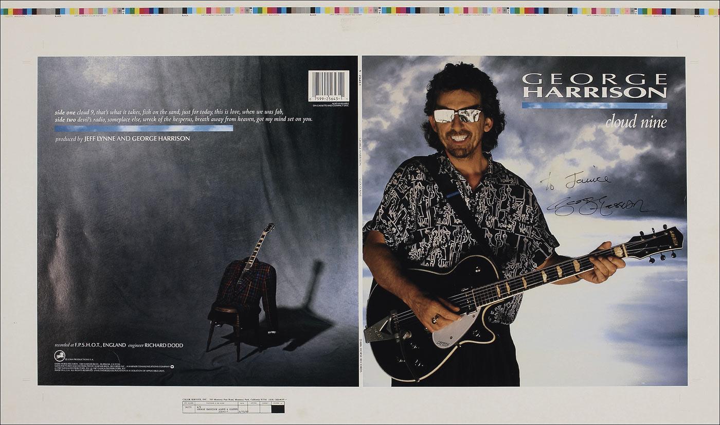 Full-size color 28.5 x 17 album slick for his solo album Cloud Nine, signed and inscribed on the front cover in black felt tip, “To Janice, George Harrison.” Rolled and in fine condition, with a few scattered light creases. Accompanied by a letter of authenticity from noted Beatles expert Perry Cox.
