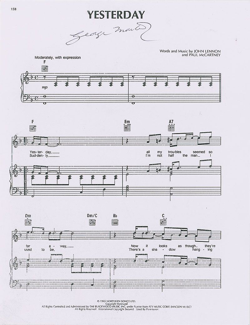 Copy of the first page of sheet music to ‘Yesterday,’ 8.5 x 11, signed at the top in black ink by Martin. In fine condition, with a few light creases to bottom.