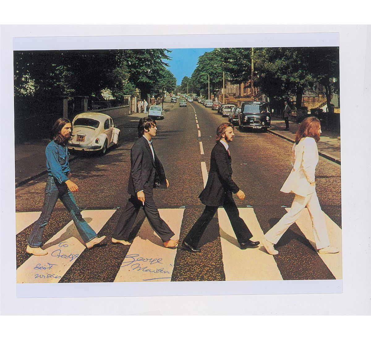 Color glossy 10 x 8 Abbey Road photo, signed and inscribed in blue ballpoint “To George, Best wishes, George Martin.” In fine condition, with a few light impressions.