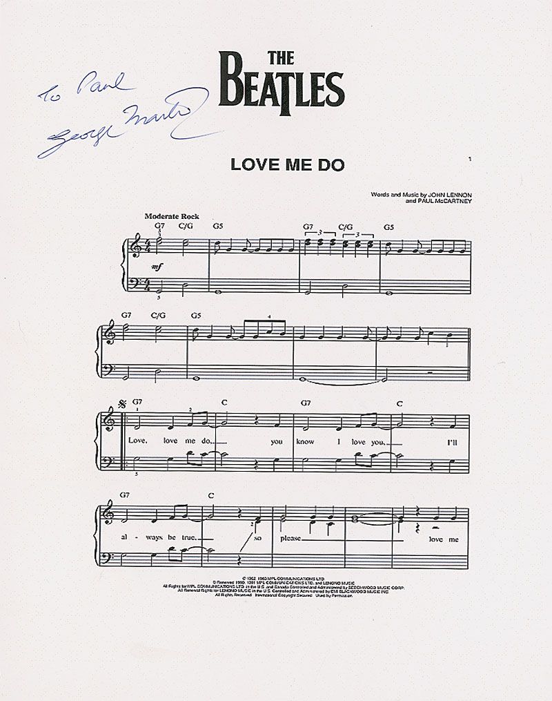 Printout of the first page of sheet music for ‘Love Me Do,’ on an off-white 8.5 x 11 sheet of cardstock, signed and inscribed at the top in blue ballpoint, “To Paul, George Martin.” In fine condition, with slightly fuzzy appearance to music and a couple c