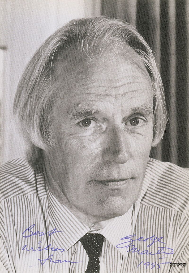 Choice 4 x 6 promotional cardstock photo, signed in blue ballpoint, “Best wishes from George Martin, 1995.” In fine condition. Accompanied by a certificate of authenticity from Tracks.