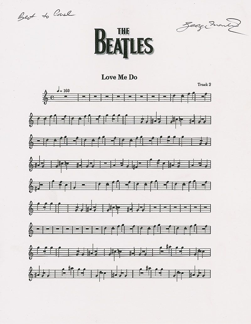 Printout of the first page of sheet music for ‘Love Me Do,’ on an off-white 8.5 x 11 sheet of cardstock, signed and inscribed at the top in blue ballpoint, “Best to Carl, George Martin.” In fine condition, with slightly fuzzy appearance to music.