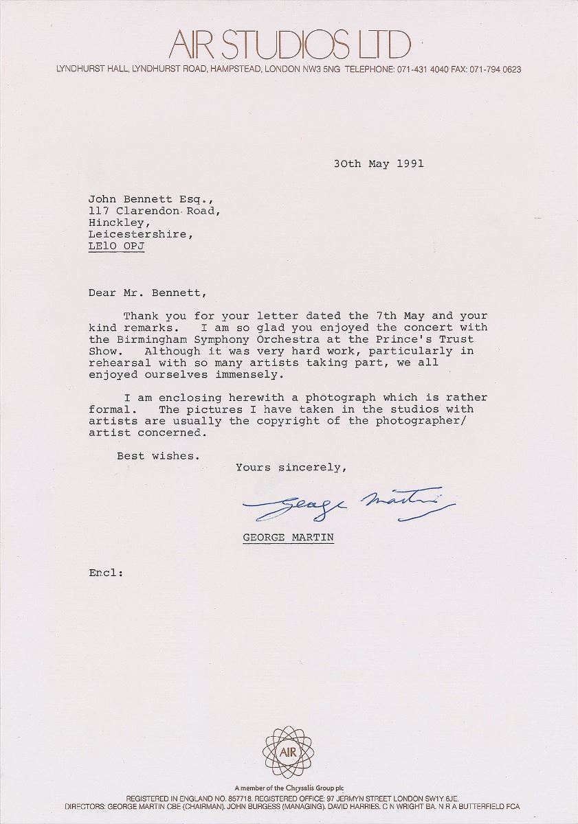 TLS signed “George Martin,” one page, 8.25 x 11.75, Air Studios Ltd letterhead, May 30, 1991. Letter to John Bennett, in part: “I am so glad you enjoyed the concert with the Birmingham Symphony Orchestra at the Prince’s Trust Show. Although it was very hard work, particularly in rehearsal with so many artists taking part, we all enjoyed ourselves immensely.” In fine condition. Accompanied by a certificate of authenticity from Tracks and the original mailing envelope.
