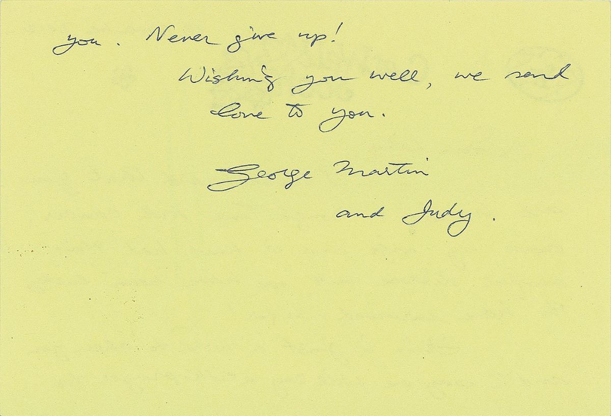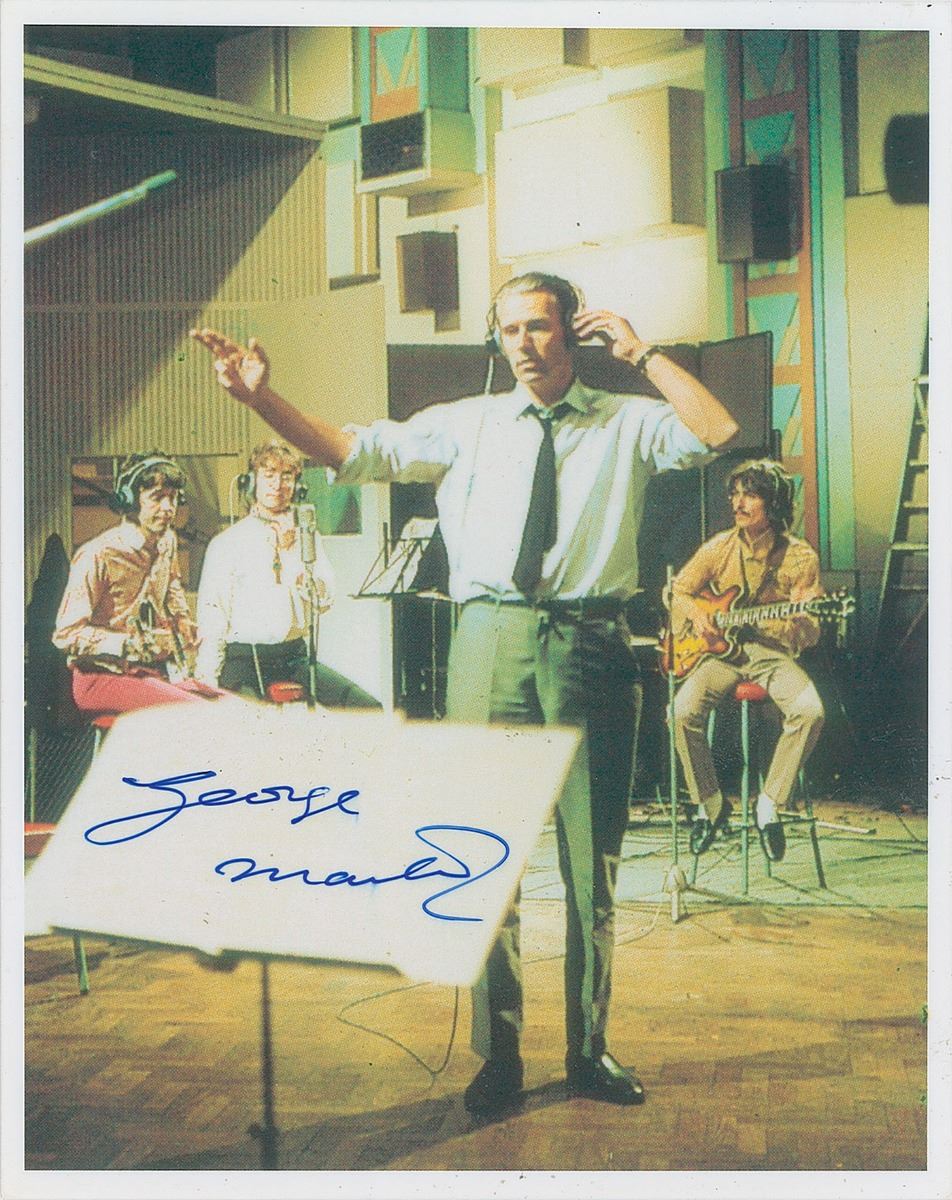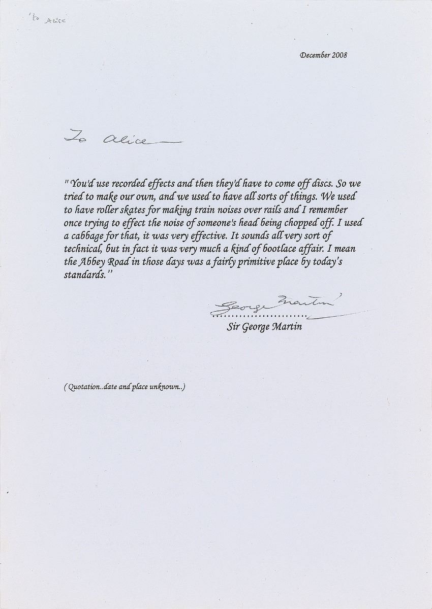 Four items: a color glossy 4.25 x 5.5 photo of Martin in the studio in front of McCartney, Lennon, and Harrison, signed in blue ink by Martin; a color glossy 4 x 6 postcard photo of the Beatles single ‘Long Tall Sally,’ signed in the lower border in blue ballpoint by Martin; a thoughtful ALS signed “George Martin and Judy,” one page both sides, 5.75 x 4, November 13, 2012, in full: “I have heard that you are having a rough time with cancer. Both my wife and I have had this awful disease but we have been lucky to have survived—so far! This is just a word to cheer you and to say we will say a little prayer for you. Never give up! Wishing you well, we send love to you”; and a TLS, one page, 8.25 x 11.75, December 2008, in full: “You’d use recorded effects and then they’d have to come off discs. So we tried to make our own, and we used to have all sorts of things. We used to have roller skates for making train noises over rails and I remember once trying to effect the noise of someone’s head being chopped off. I used a cabbage for that, it was very effective. It sounds all very sort of technical, but in fact it was very much a kind of bootlace affair. I mean the Abbey Road in those days was a fairly primitive place by today’s standards.” In overall fine condition.