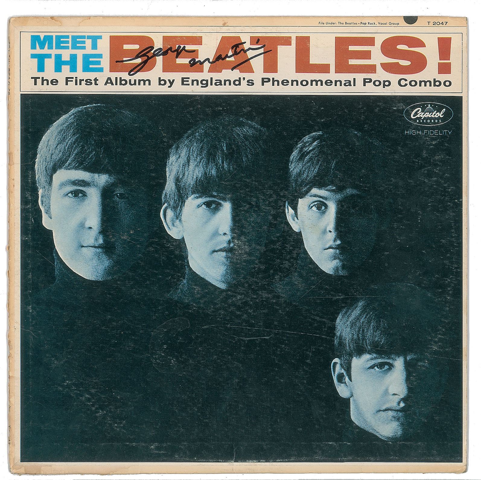 Meet the Beatles! album signed on the front cover in black felt tip by George Martin. In very good to fine condition, with light edge wear, and staining to the back cover. The record is not included.