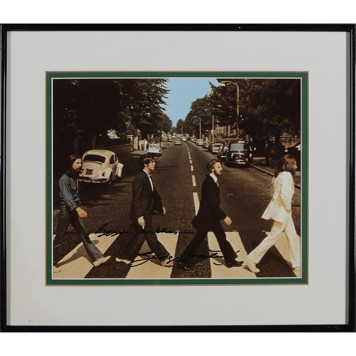 Color 10 x 8 photo of the famous Abbey Road cover photo, signed in black felt tip, “Best wishes, George Martin.” Double matted and framed to an overall size of 13.75 x 12. Scattered light creasing, lightly affecting a few letters of signature and sentiment, otherwise fine condition.