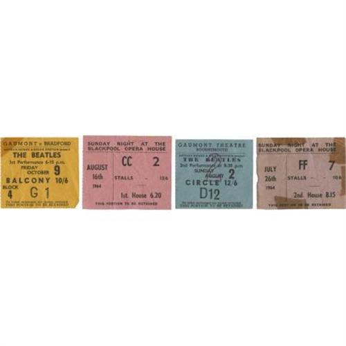 <B>Beatles Group of 4 Ticket Stubs.</B></I> Blackpool Opera House, Blackpool, August 16, 1964; condition: VG- (staple holes and residue stain, visible vertical folds). Gaumont, Bradford, October 9, 1964, for the first performance; condition: GD (tape stain over right corner text, visible creases, corner wear, writing en verso). Gaumont Theatre, Bournemouth, August 2, 1964, for second performance; condition VG (visible creases). Blackpool Opera House, July 26, 1964; condition: GD (tape stains partially covering various areas of text, border wear, visible creasing).<BR><BR><b>Shipping:</b> Flat Material, Small (<a target="_blank" href="http://www.heritageauctions.com/common/shipping.php">view shipping information</a>)