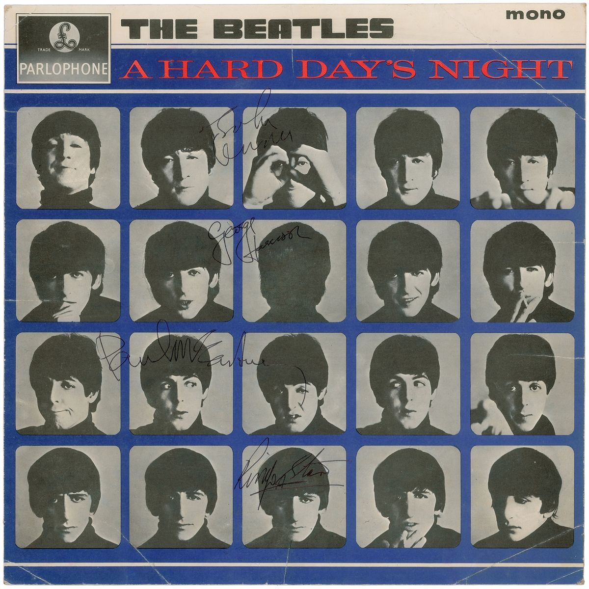 Fantastic and extremely rare unlaminated front cover to the band’s A Hard Day’s Night album presented to a stewardess on The Beatles’ flight from London to Liverpool on July 10, 1964, signed in black ballpoint, “John Lennon,” “George Harrison,” “Paul McCartney,” and “Ringo Starr,” with each band member signing on the line of his image. Scattered edge and corner creases, otherwise fine condition.
