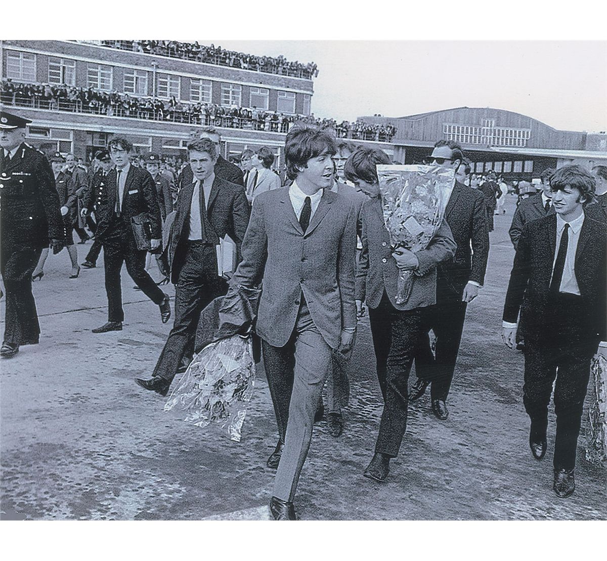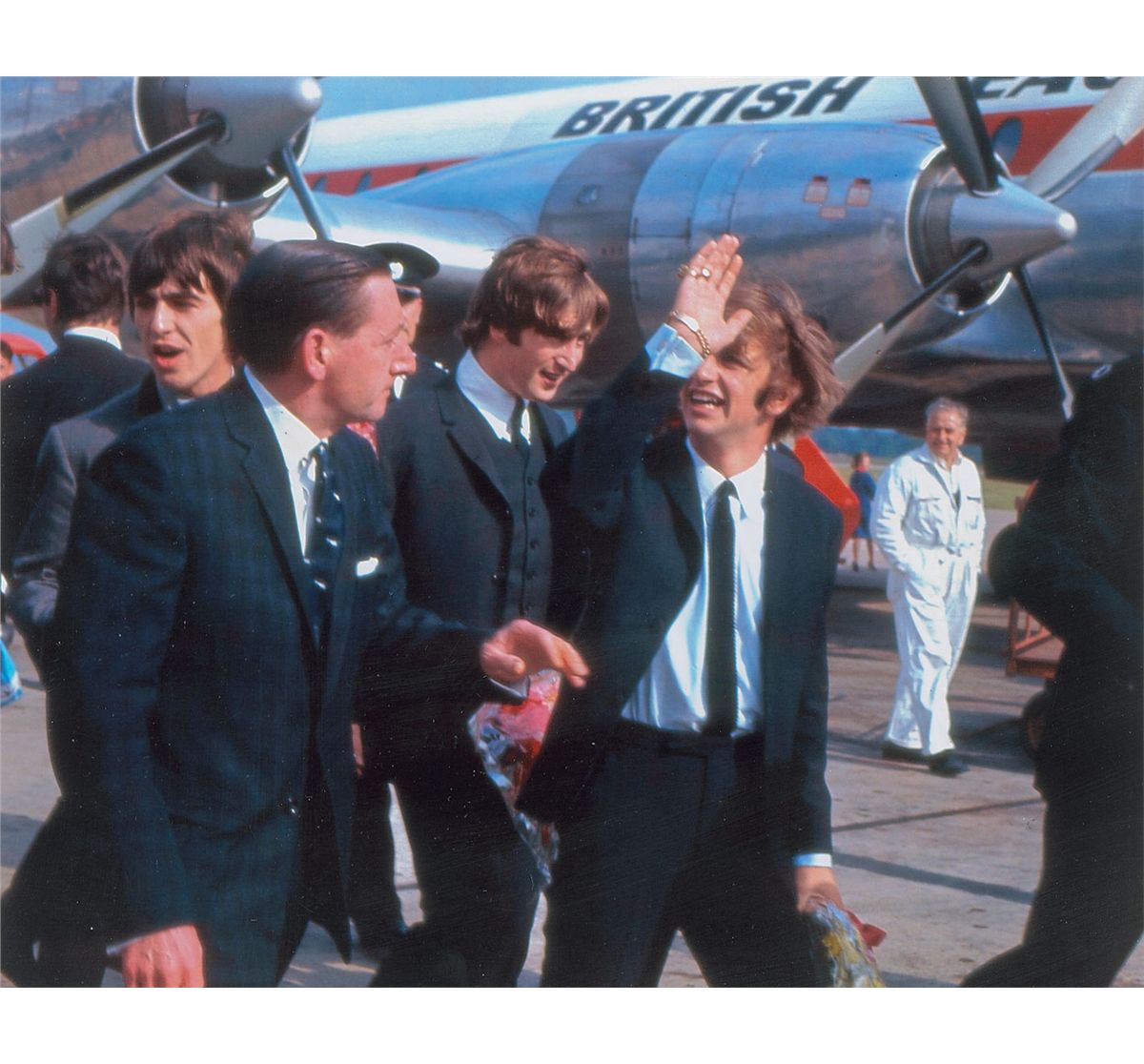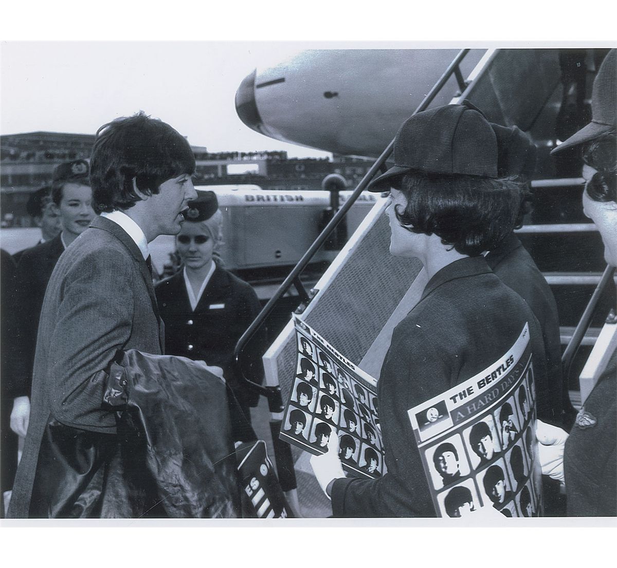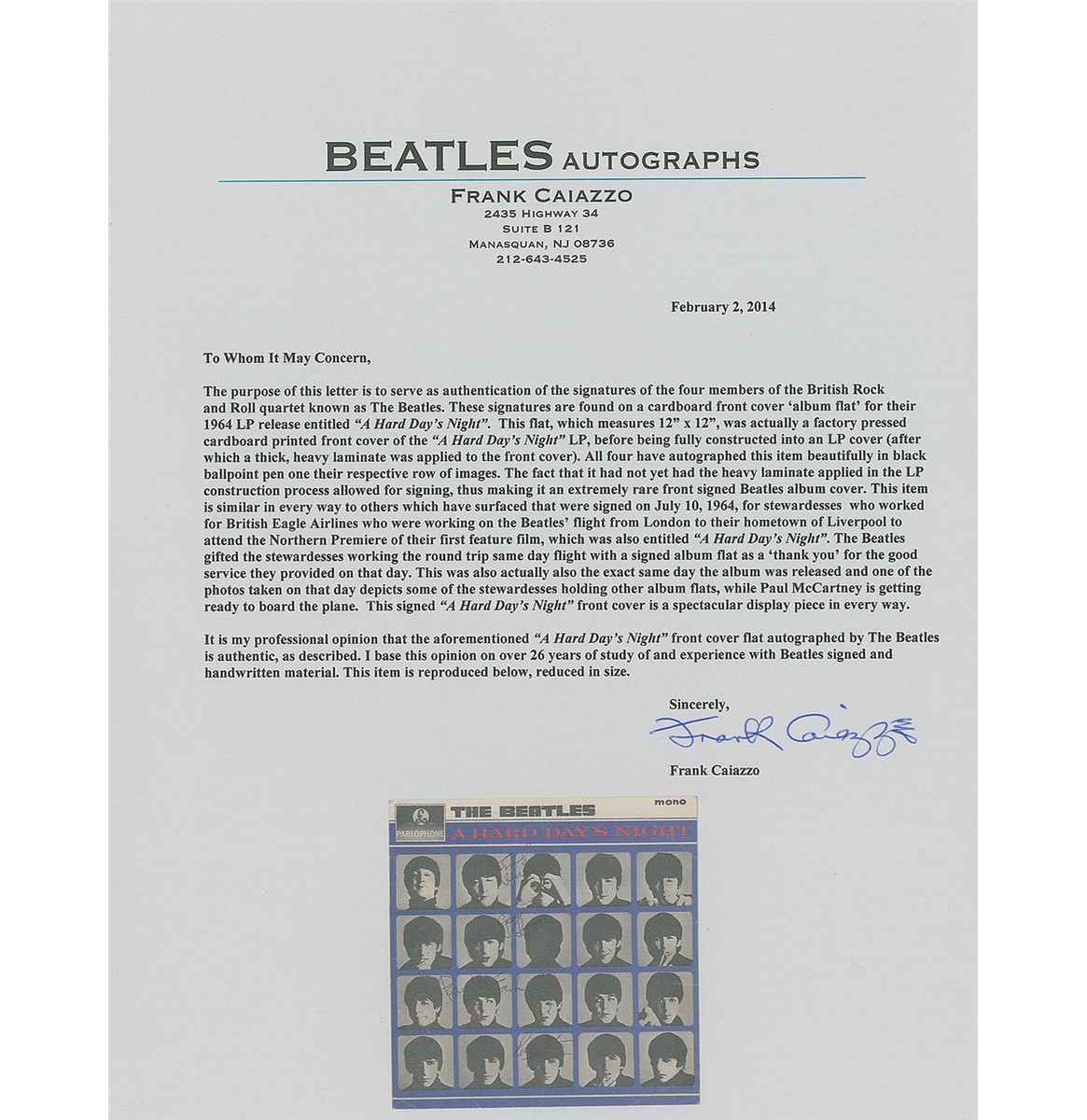 Accompanied by a letter of authenticity from noted Beatles expert Frank Caiazzo, which reads, in part: “This flat…was actually a factory pressed cardboard printed front cover of the ‘A Hard Day’s Night’ LP, before being fully constructed into an LP cover (after which a thick, heavy laminate was applied to the front cover). All four have autographed the item beautifully in black ballpoint pen…The fact that it had not yet had the heavy laminate applied in the LP construction process allowed for signing, thus making it an extremely rare front signed Beatles album cover. This item is similar in every way to others which have surfaced which were signed on July 10, 1964, for stewardesses who worked for British Eagle Airlines who were working on the Beatles’ flight from London to their hometown of Liverpool to attend the Northern Premiere of their first feature film…The Beatles gifted the stewardesses working the round trip same day flight with a signed album flat as a ‘thank you’ for the good service they provided on that day…One of the photos taken on that day depicts some of the stewardesses holding other album flats, while Paul McCartney is getting ready to board the plane.” Also included are five second-generation photos from July 10, 1964, including the photo mentioned in Caiazzo’s letter.