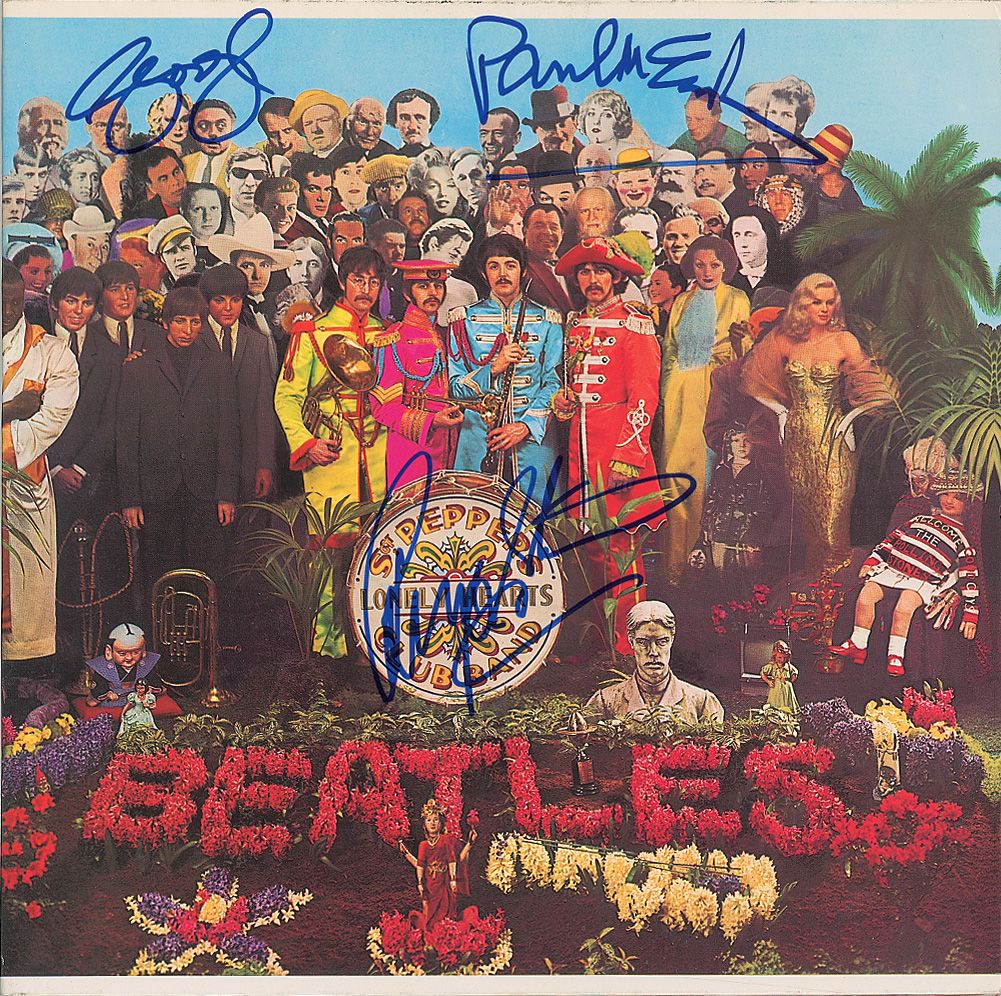 Sgt. Pepper’s Lonely Hearts Club Band album signed on the front cover in blue felt tip by Paul McCartney, George Harrison, and Ringo Starr, with George signing his first name only. In fine condition, with a few trivial creases along the top border. The record is not included. All three signatures were obtained in person by George Napolitano between 1988 and 1992. Accompanied by full letters of authenticity from Beatles expert Frank Caiazzo, Roger Epperson/REAL, Perry Cox, PSA/DNA, and JSA, and a letter of provenance from Napolitano. This album signed by all three is incredibly scarce—especially in such fine condition—and the first of its type that we have offered. Easily one of the most well-documented Beatles signed albums in existence.