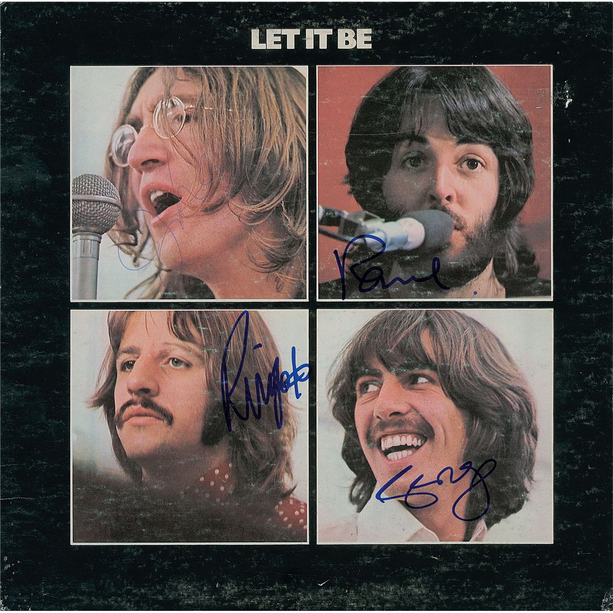 Let It Be album signed in-person on the front cover in blue felt tip by Paul McCartney, George Harrison, and Ringo Starr, each signing over his image with his first name only. Lennon’s image also bears a light ‘signature’ in an unknown hand. Scattered rubbing wear, dings to the corners, and some rippling to back cover from moisture exposure, otherwise fine condition. The record is not included. McCartney, Harrison, and Starr signatures all originally obtained by in-person specialist Mike Wehrmann.