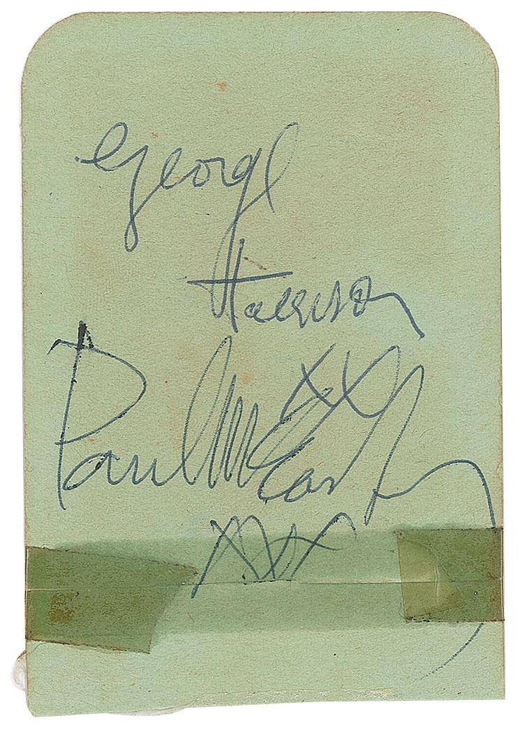 Vintage ballpoint signatures, "George Harrison" and "Paul McCartney, xxx," on a green 2.5 x 3.75 album page. In very good condition, with a light block of toning, and old tape along a slice at the bottom.