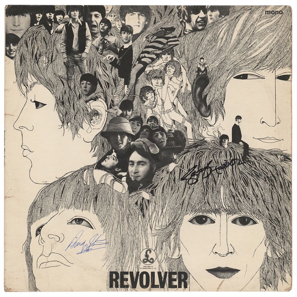 Revolver album signed in black felt tip by George Harrison and in blue ballpoint by Ringo Starr. In very good to fine condition, with light edge creasing, and scattered light surface gouges, most noticeable on George's face. The record is not included. A classic Beatles album cover signed by half of the 'Fab Four.'