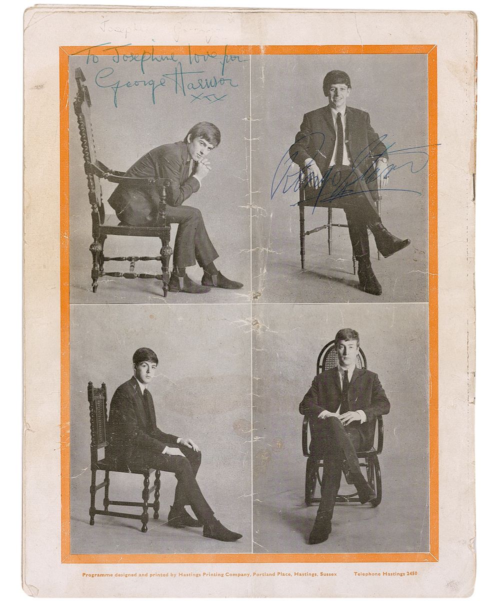 Original program from the Chris Montez and Tommy Roe tour, 8 x 10.25, 14 pages. Signed and inscribed in blue ballpoint on the back cover next to their images, “To Josephine love from George Harrison xxx,” and “Ringo Starr.” Cover also bears extremely light traces of the impression of a McCartney signature which has faded and is not legible. Signatures were acquired on March 10, 1963, after the program was passed through a dressing room window at the Birmingham Hippodrome. In good condition, with back cover partially detached, a moderate vertical fold, tear to right edge, impression from a Montez signature on the inside of back cover, overall creasing and light toning to back cover, as well as moderate creasing and a small edge tear to front cover. Accompanied by a certificate of authenticity from Tracks as well as a letter of provenance from the original recipient which reads, in part: “It was there [sic] first tour…as they had been added to an existing tour as ‘guest artists.’ Myself and a friend had managed to find a way round the side of the Hippodrome, into an alley, which the dressing room windows opened onto, and we spoke to the Beatles through the window. I asked George for their autographs and he gave us two programmes from a pile…My programme had been signed by Paul, George, and Ringo…Paul’s signature…has disappeared.”