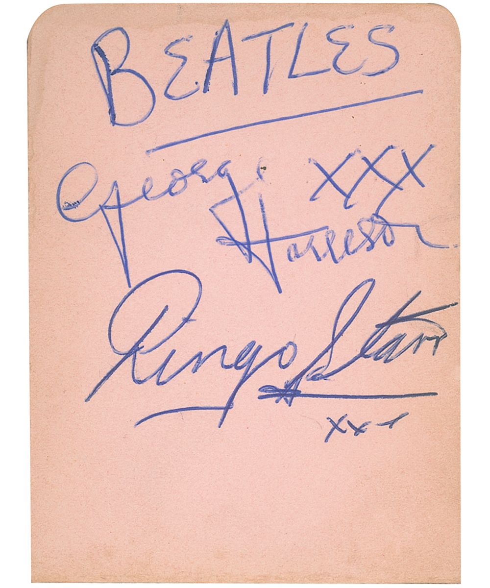 Vintage ballpoint signatures, “Beatles, George Harrison xxx,” and “Ringo Starr xxx,” on a salmon-colored 3 x 4 album page, still contained in its original autograph album. In fine condition, with a bit of trivial foxing and a bit of light dampstaining above the band’s title. Signatures were obtained on March 13, 1963, at the Rialto Theatre, York, and are accompanied by a letter of provenance stating “The autographs were obtained when the Beatles gave a performance at The Rialto York In 1962 or 1963 (Not quite sure). John was not present as he was ill at the time.” Also accompanied by a certificate of authenticity from Tracks.