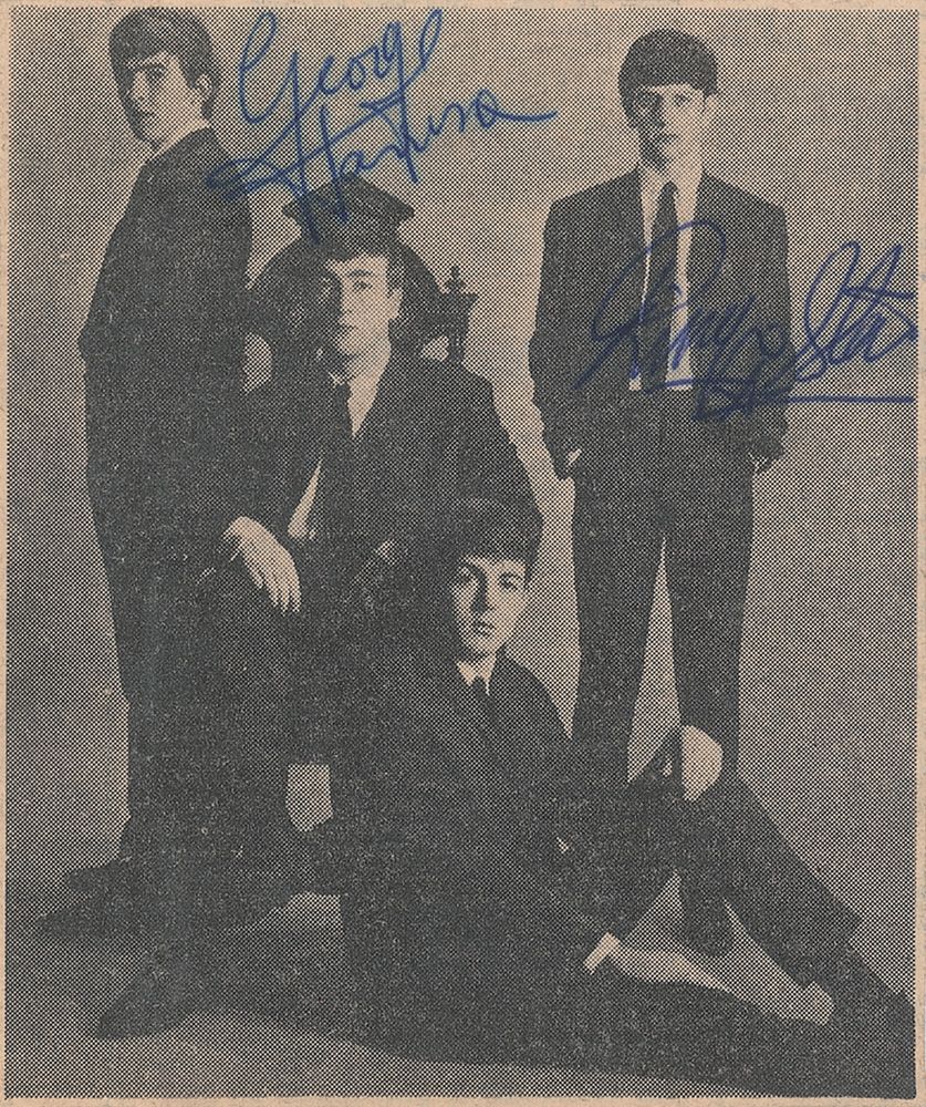 Vintage 4 x 5 newspaper 1963 photo of the Beatles, signed in blue ink, “George Harrison,” and “Ringo Starr.” Signatures were obtained circa early 1963. In fine condition.