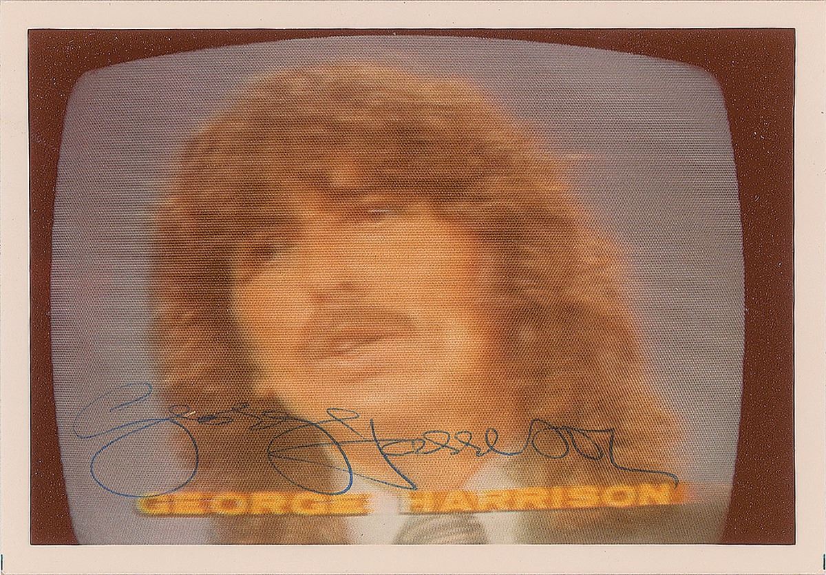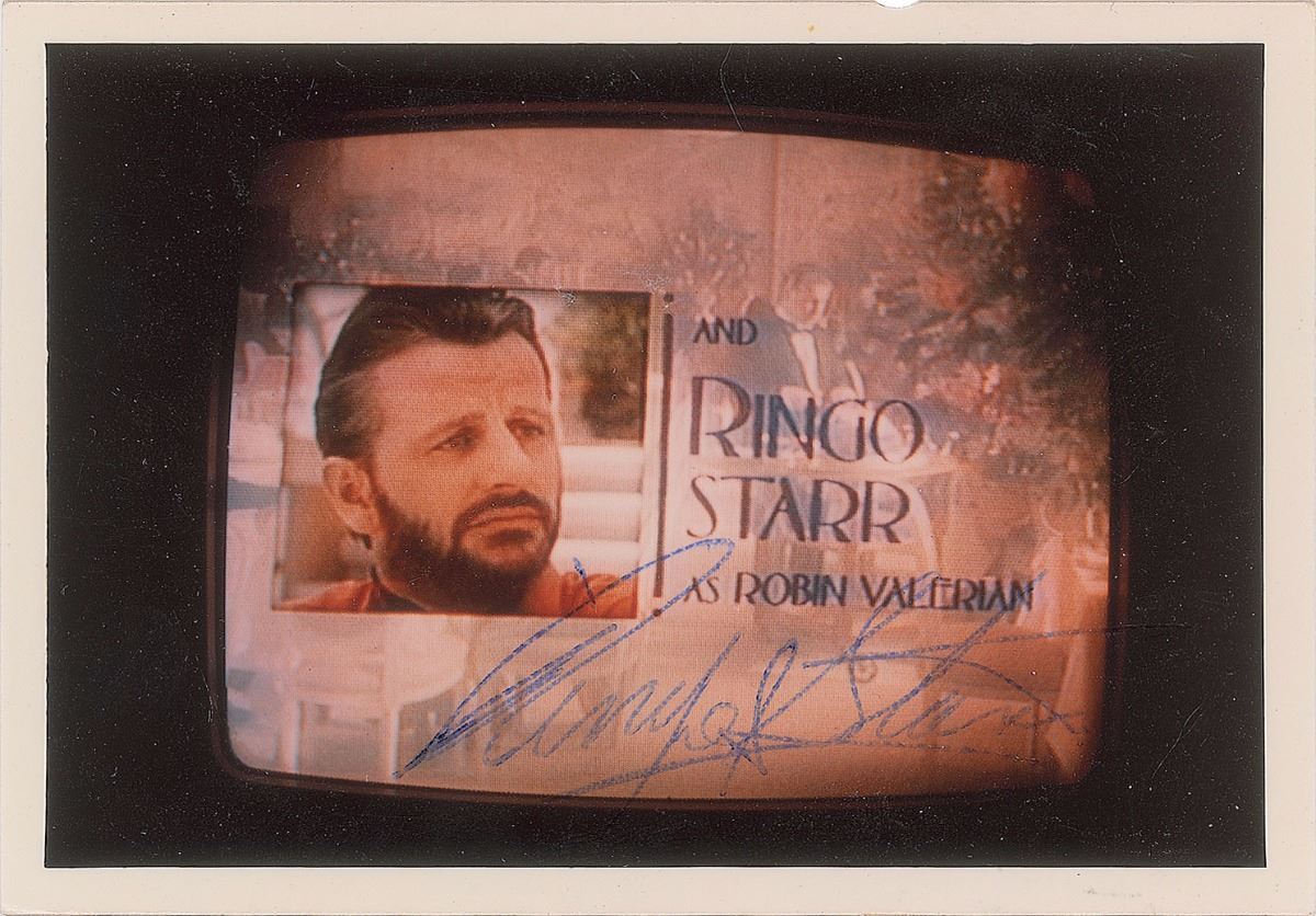 Two signed photos: an unusual color semi-glossy 5 x 3.5 photo of a long-haired George Harrison on a television screen, signed in blue ballpoint by Harrison; and a color semi-glossy 5 x 3.5 photo of a television screen showing Ringo Starr as Robin Valerian during the credits of the 1983 TV movie Princess Daisy, signed in blue ballpoint by Starr. In overall fine condition.