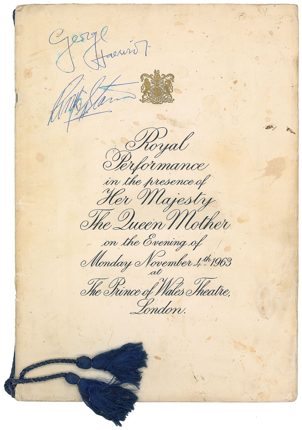 Program for the infamous appearance of the Beatles at the Prince of Wales Theatre in London on November 4, 1963, for a royal variety performance before the Queen Mother, 8.25 x 11.75, signed on the front cover in blue ballpoint, "George Harrison" and "Ringo Starr." In very good condition, with scattered staining to the cover and moisture spots affecting both signatures. Accompanied by a certificate of authenticity from Tracks. This was the event where John Lennon took a jab at the Crown with his famous bit of stage banter: 'For our last number I'd like to ask your help. The people in the cheaper seats clap your hands. And the rest of you, if you'd just rattle your jewelry.'