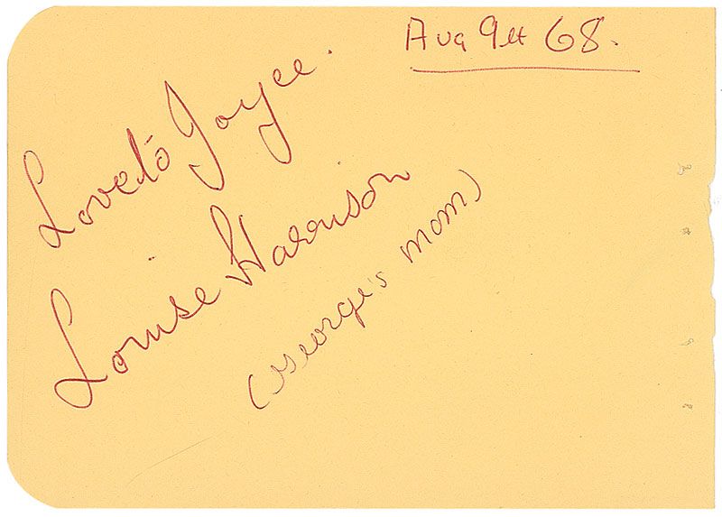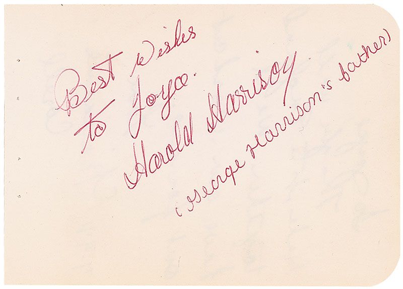 Vintage ballpoint signatures and inscriptions, “Love to Joyce, Louise Harrison” and “Best wishes to Joyce, Harold Harrison,” on individual 5 x 3.75 album pages bearing collector’s notations identifying the signatures and dating one August 9, 1968. In overall fine condition.