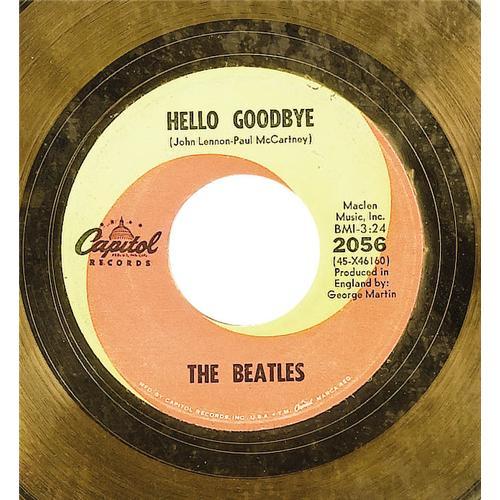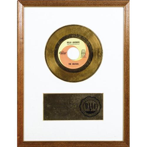 <B>Beatles "Hello, Goodbye" RIAA Gold Single Award.</B></I> Presented to the Beatles by the RIAA to commemorate the sale of 500,000 copies of the single, released during Christmas 1967 and a chart-topper on both sides of the pond. In Excellent condition, framed to an overall size of 17" x 21".<BR><BR><b>Shipping:</b> Framed - with Glass, Small (<a target="_blank" href="http://www.heritageauctions.com/common/shipping.php">view shipping information</a>)