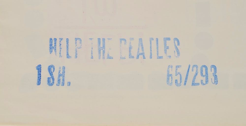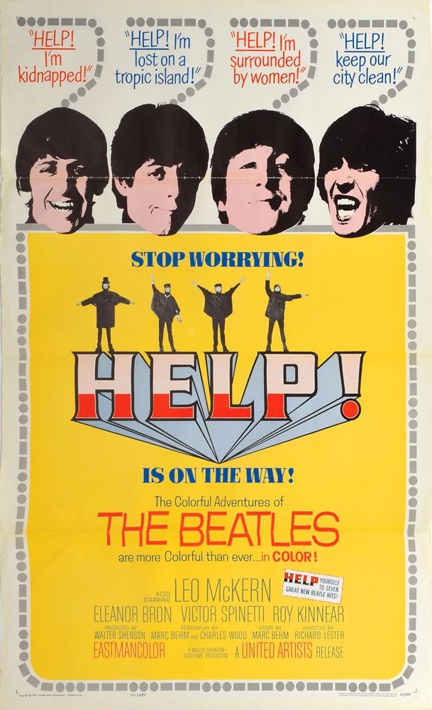 Original color 27 x 41 one-sheet movie poster for the 1965 film Help!, showing 'floating heads' of each Beatle member along the top and reading below, "Stop worrying! Help! is on the way! The Colorful Adventures of The Beatles are more Colorful than ever…in COLOR!" In fine condition, with scattered creasing and horizontal folds.