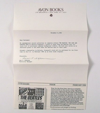 A rare mint condition pre-publication publishers book for American publication of the classic "The Long & Winding Road: A History of the Beatles On Record" by Neville Stannard (1983). It includes the original letter given out with the book to credits and the press by Ann C. McKeown, Publicity Manager for Avon Books.