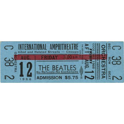 <B>Beatles International Amphitheatre Concert Ticket.</B></I> An unused ticket from their August 12, 1966, show in Chicago, the first performance of their final concert tour. During their usual press conference the day before, the band tried to placate the American public in regards to John's infamous "We're more popular than Jesus" statement. The ticket is in Very Fine condition with mild wear and a crease in the center.<BR><BR><b>Shipping:</b> Small Flat (<a target="_blank" href="http://www.heritageauctions.com/common/shipping.php">view shipping information</a>)